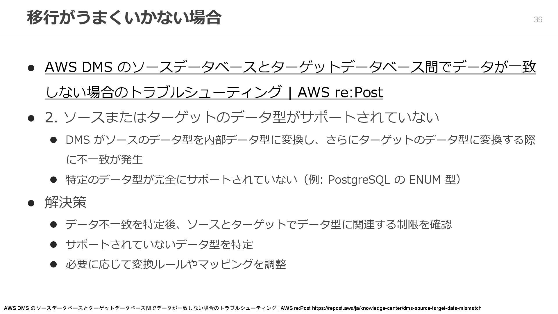 30. 39 ⚫ AWS DMS のソースデータベースとターゲットデータベース間でデータが一致 しない場合のトラブルシューティング | AWS re:Post ⚫