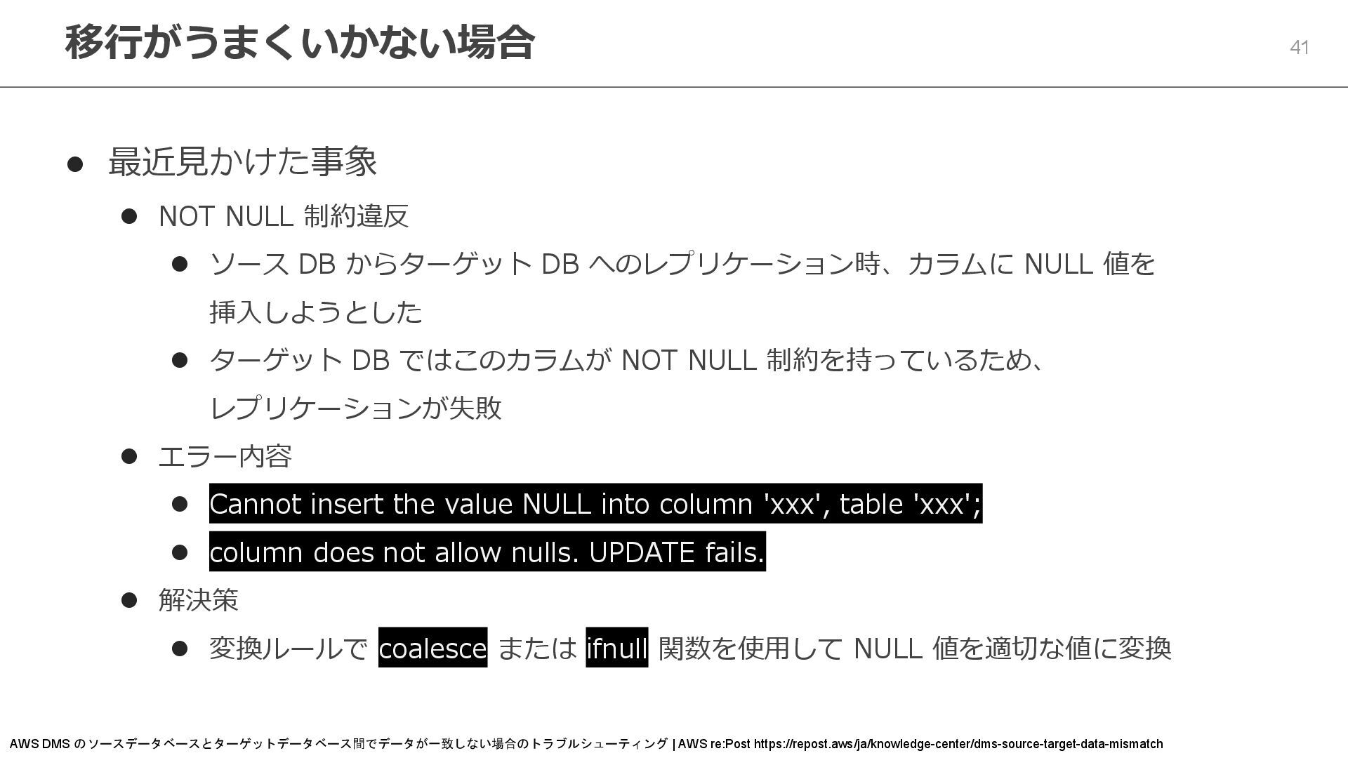 からターゲット DB へのレプリケーション時、カラムに NULL 値を 挿入しようとした ⚫ ターゲット DB ではこのカラムが NOT NULL 制約を持っているため、 レプリケーションが失敗 ⚫ エラー内容 ⚫ Cannot insert the value NULL into column 'xxx', table 'xxx'; ⚫ column does not allow nulls. UPDATE fails. ⚫ 解決策 ⚫ 変換ルールで coalesce または ifnull 関数を使用して NULL 値を適切な値に変換 移行がうまくいかない場合 AWS DMS のソースデータベースとターゲットデータベース間でデータが一致しない場合のトラブルシューティング | AWS re:Post https://repost.aws/ja/knowledge-center/dms-source-target-data-mismatch