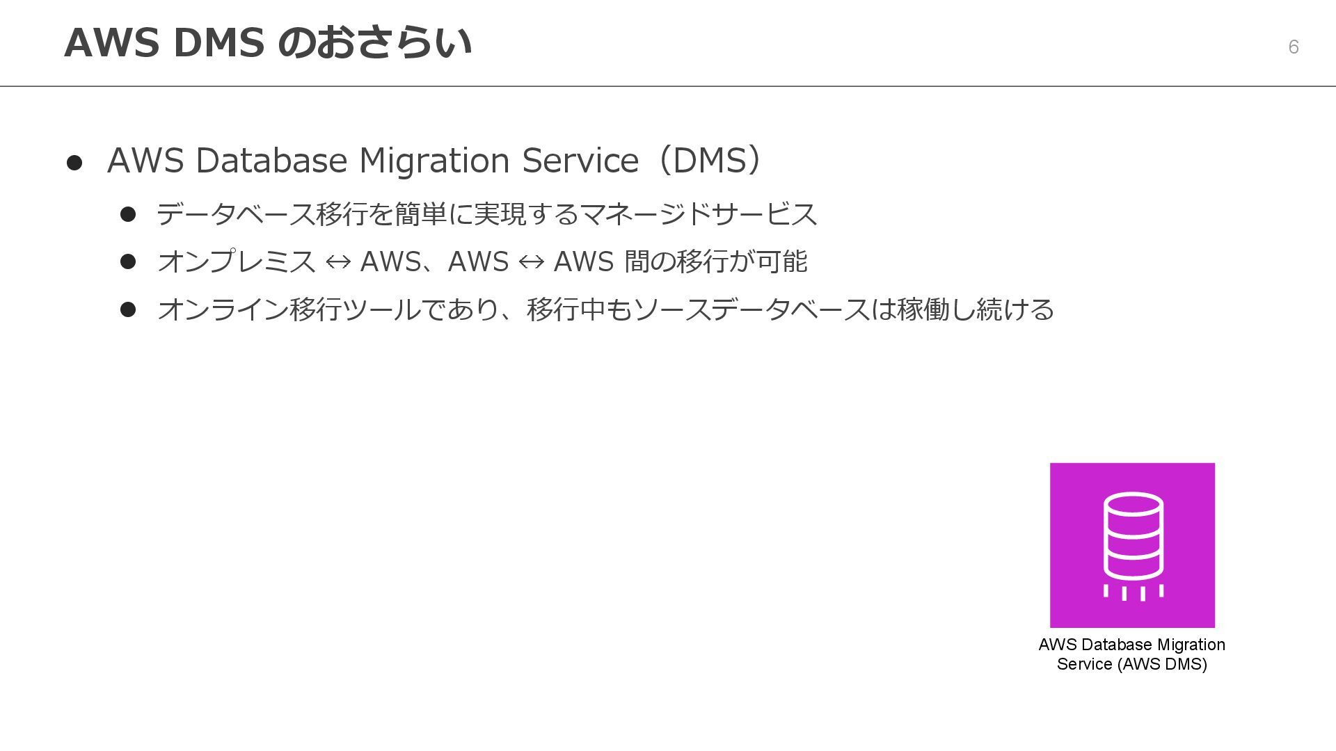 4. 6 ⚫ AWS Database Migration Service(DMS) ⚫ データベース移行を簡単に実現するマネージドサービス ⚫ オンプレミス