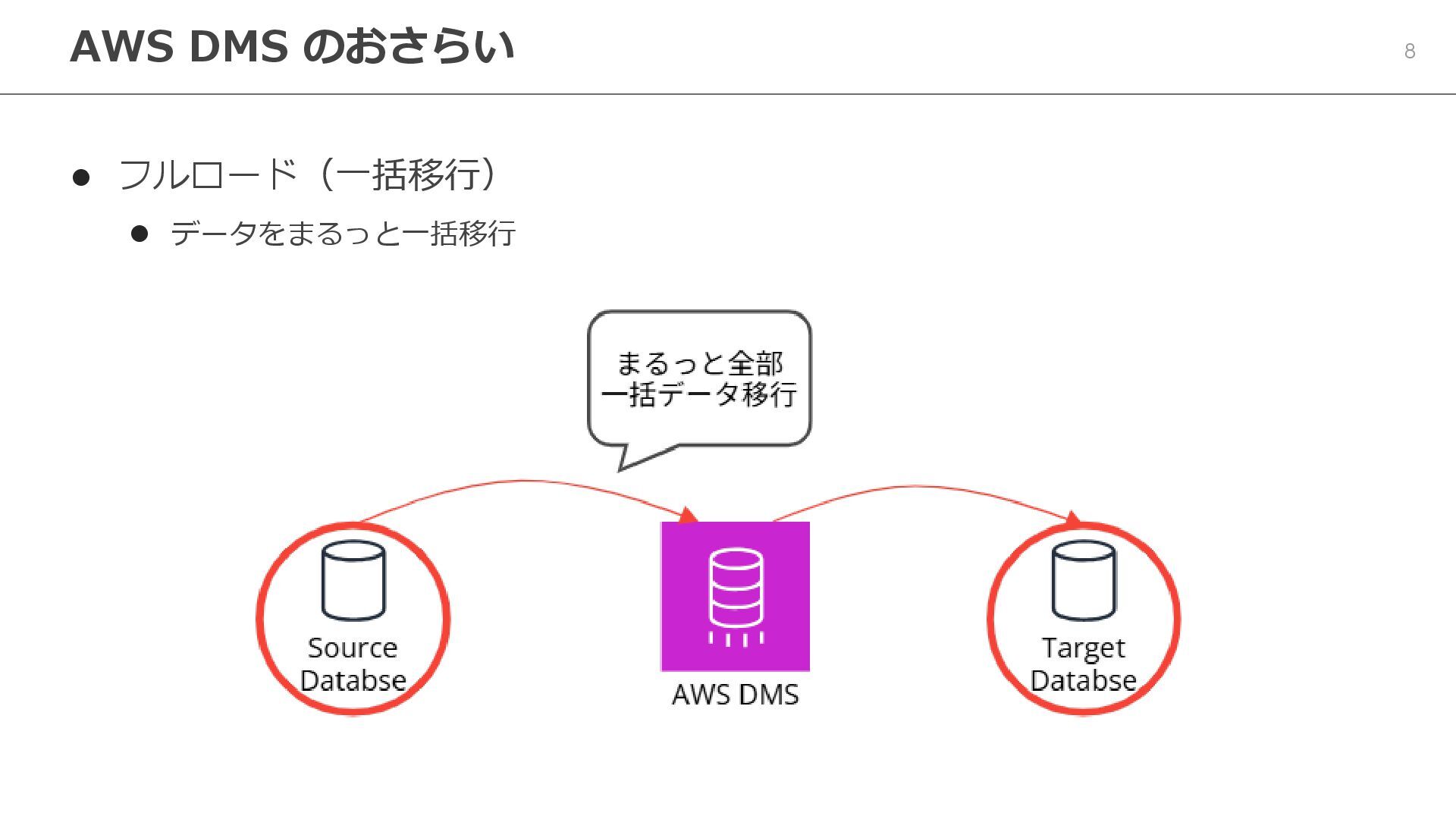 AWS、AWS AWS 間の移行が可能 ⚫ オンライン移行ツールであり、移行中もソースデータベースは稼働し続ける AWS DMS のおさらい AWS Database Migration Service (AWS DMS)