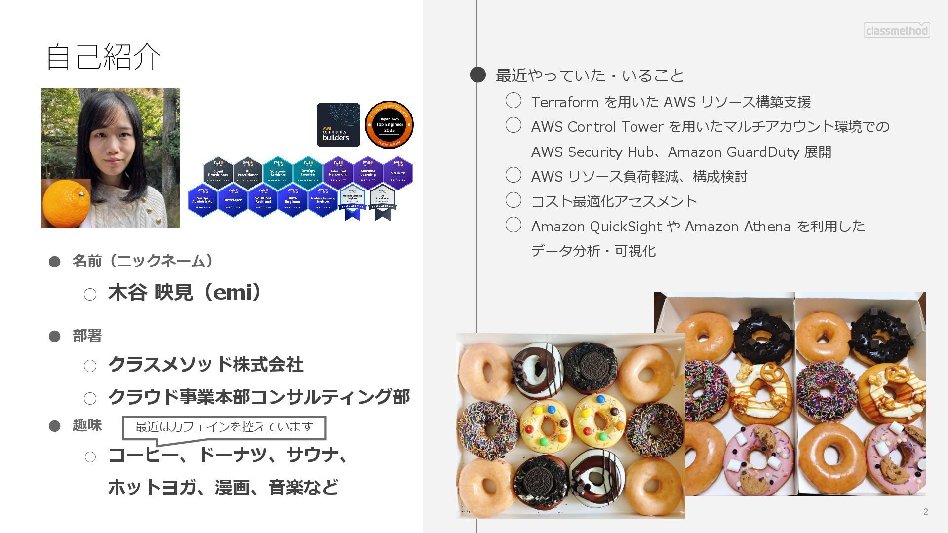 AWS Control Tower を用いたマルチアカウント環境での AWS Security Hub、Amazon GuardDuty 展開 ◦ AWS リソース負荷軽減、構成検討 ◦ コスト最適化アセスメント ◦ Amazon QuickSight や Amazon Athena を利用した データ分析・可視化 • 名前(ニックネーム) ◦ 木谷 映見(emi) • 部署 ◦ クラスメソッド株式会社 ◦ クラウド事業本部コンサルティング部 • 趣味 ◦ コーヒー、ドーナツ、サウナ、 ホットヨガ、漫画、音楽など AWS Certified Cloud Practitioner バ ッ ジ AWS Certified AI Practitioner バ ッ ジ AWS Certified Solutions Architect - Professional バ ッ ジ AWS Certified DevOps Engineer - Professional バ ッ ジ AWS Certified Advanced Networking - Specialty バ ッ ジ AWS Certified Machine Learning - Specialty AWS Certified Security - Specialty バ ッ ジ AWS Certified SysOps Administrator - Associate バ ッ ジ AWS Certified Developer - Associate バ ッ ジ AWS Certified Solutions Architect - Associate バ ッ ジ AWS Certified Data Engineer - Associate バ ッ ジ AWS Certified Machine Learning Engineer - Associate バ ッ ジ AWS Certified Cloud Practitioner バ ッ ジ AWS Certified AI Practitioner バ ッ ジ AWS Certified Solutions Architect - Professional バ ッ ジ AWS Certified DevOps Engineer - Professional バ ッ ジ AWS Certified Advanced Networking - Specialty バ ッ ジ AWS Certified Machine Learning - Specialty AWS Certified Security - Specialty バ ッ ジ AWS Certified SysOps Administrator - Associate バ ッ ジ AWS Certified Developer - Associate バ ッ ジ AWS Certified Solutions Architect - Associate バ ッ ジ AWS Certified Data Engineer - Associate バ ッ ジ AWS Certified Machine Learning Engineer - Associate バ ッ ジ 最近はカフェインを控えています