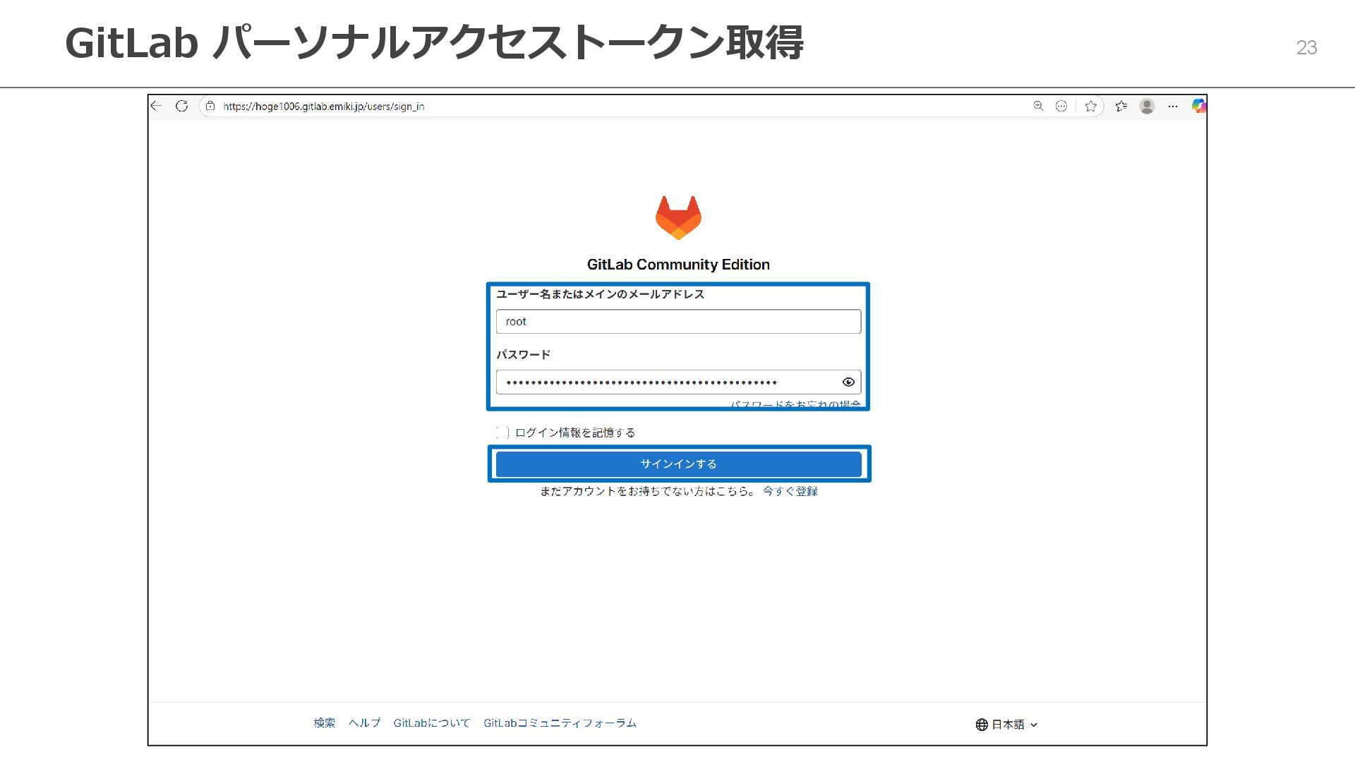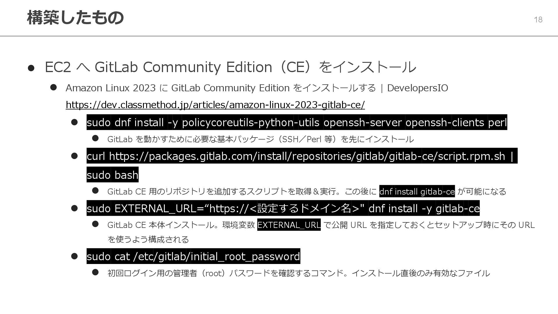 2023 に GitLab Community Edition をインストールする | DevelopersIO https://dev.classmethod.jp/articles/amazon-linux-2023-gitlab-ce/ ⚫ sudo dnf install -y policycoreutils-python-utils openssh-server openssh-clients perl ⚫ GitLab を動かすために必要な基本パッケージ(SSH/Perl 等)を先にインストール ⚫ curl https://packages.gitlab.com/install/repositories/gitlab/gitlab-ce/script.rpm.sh | sudo bash ⚫ GitLab CE 用のリポジトリを追加するスクリプトを取得&実行。この後に dnf install gitlab-ce が可能になる ⚫ sudo EXTERNAL_URL=“https://<設定するドメイン名>" dnf install -y gitlab-ce ⚫ GitLab CE 本体インストール。環境変数 EXTERNAL_URL で公開 URL を指定しておくとセットアップ時にその URL を使うよう構成される ⚫ sudo cat /etc/gitlab/initial_root_password ⚫ 初回ログイン用の管理者(root)パスワードを確認するコマンド。インストール直後のみ有効なファイル 構築したもの