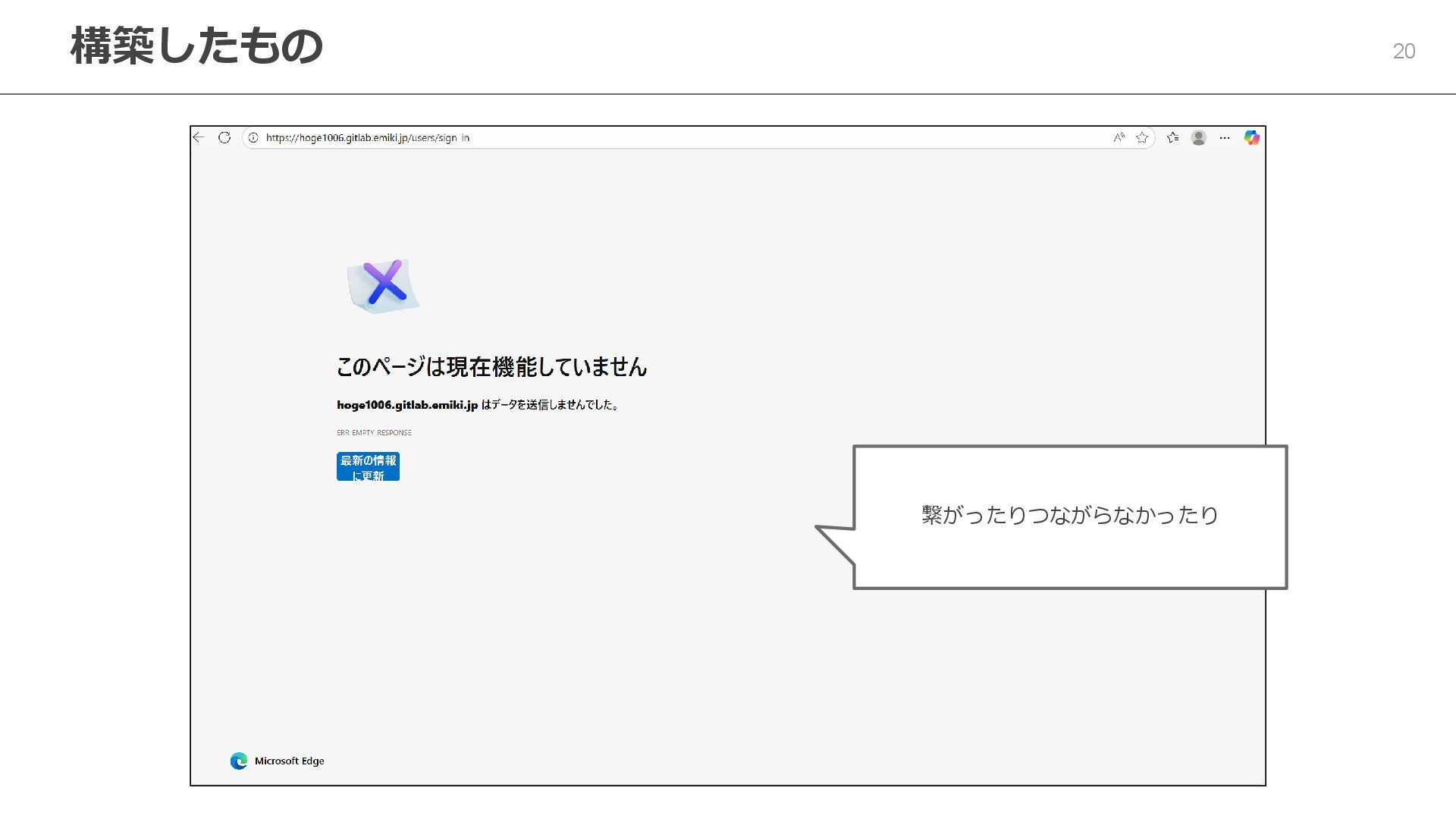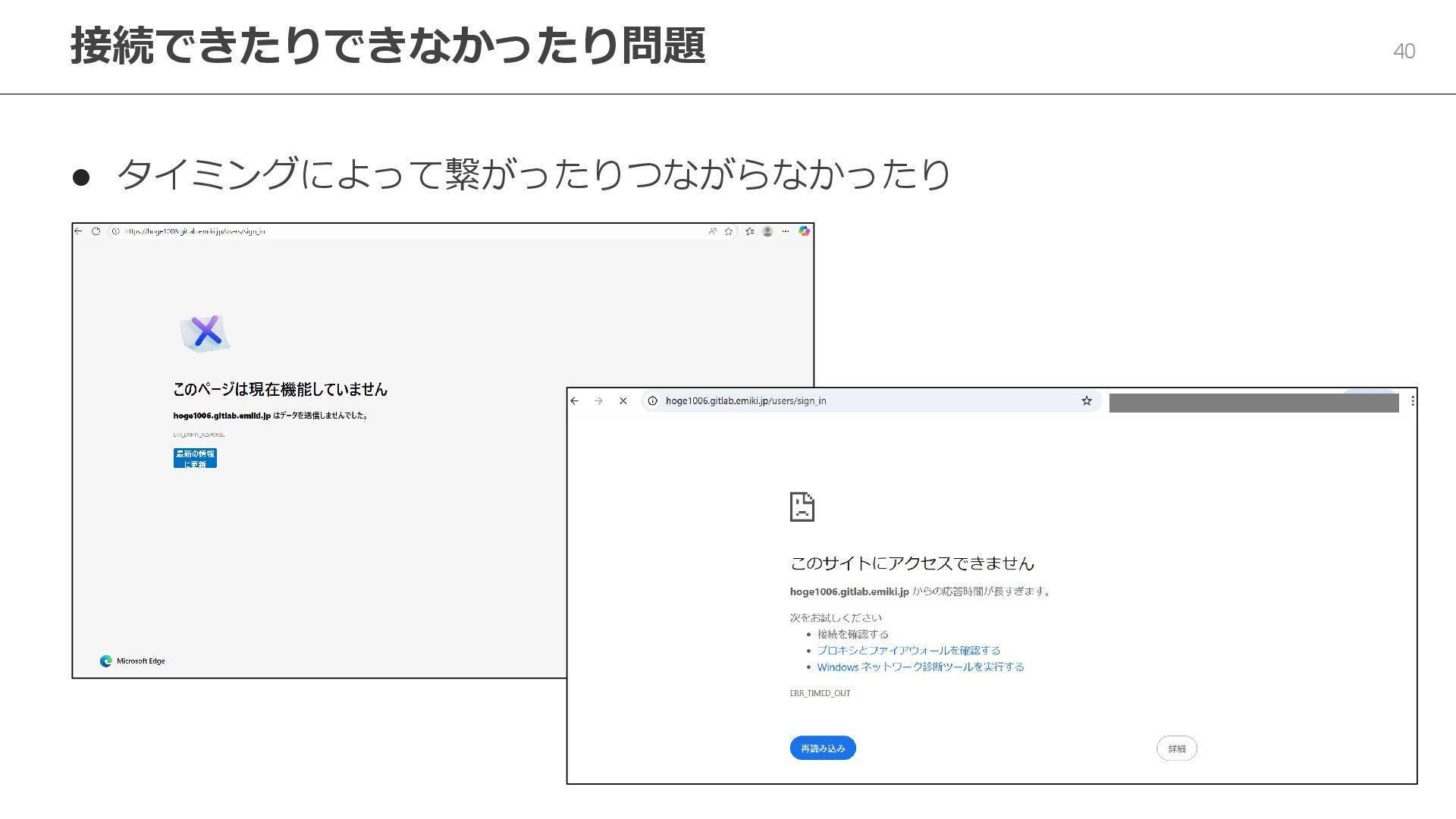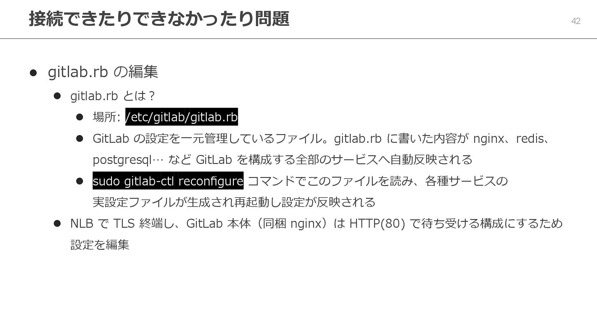 ⚫ GitLab の設定を一元管理しているファイル。gitlab.rb に書いた内容が nginx、redis、 postgresql… など GitLab を構成する全部のサービスへ自動反映される ⚫ sudo gitlab-ctl reconfigure コマンドでこのファイルを読み、各種サービスの 実設定ファイルが生成され再起動し設定が反映される ⚫ NLB で TLS 終端し、GitLab 本体(同梱 nginx)は HTTP(80) で待ち受ける構成にするため 設定を編集 接続できたりできなかったり問題