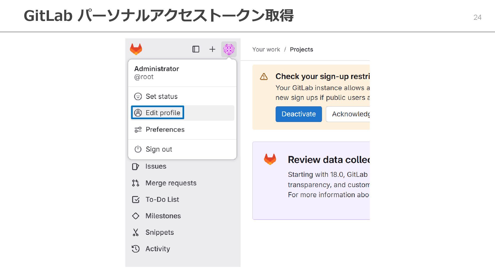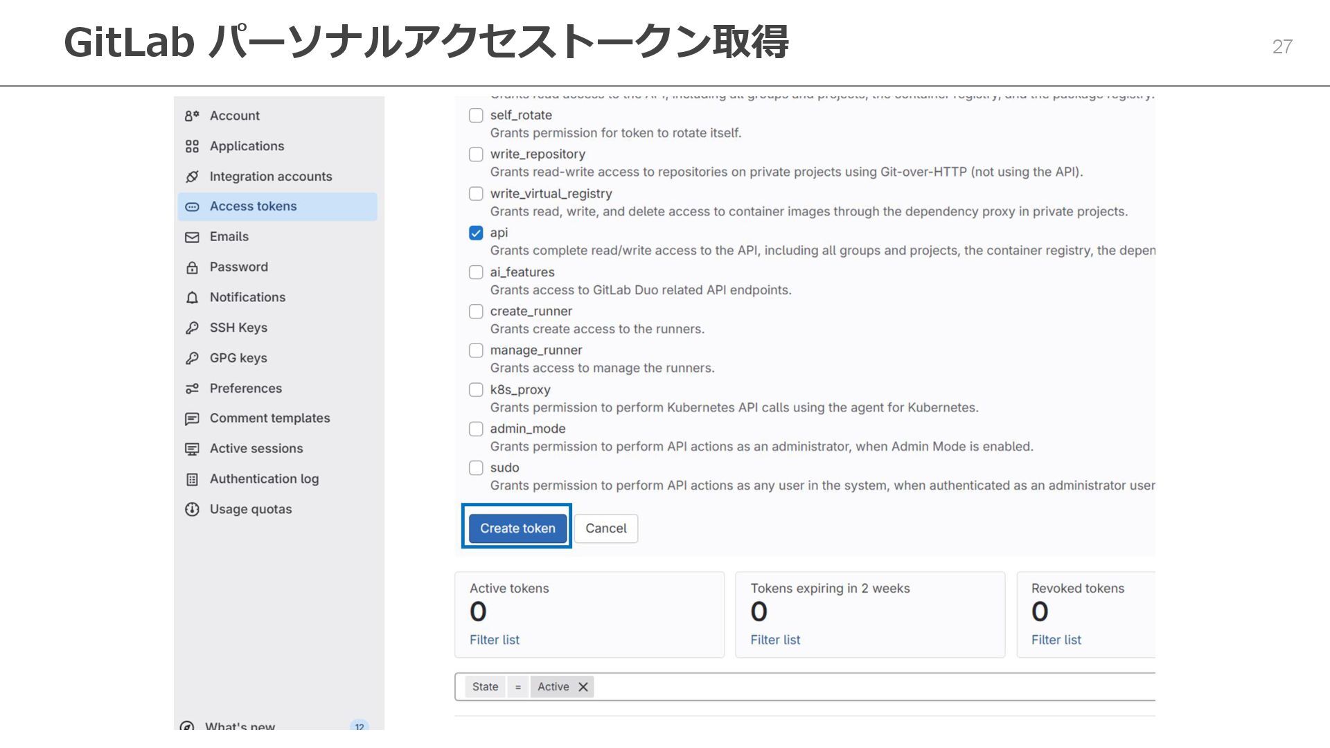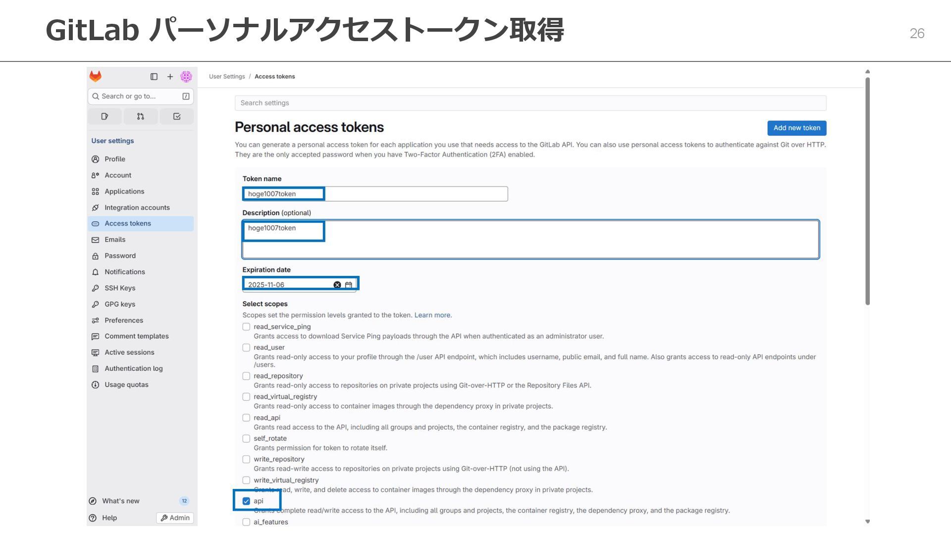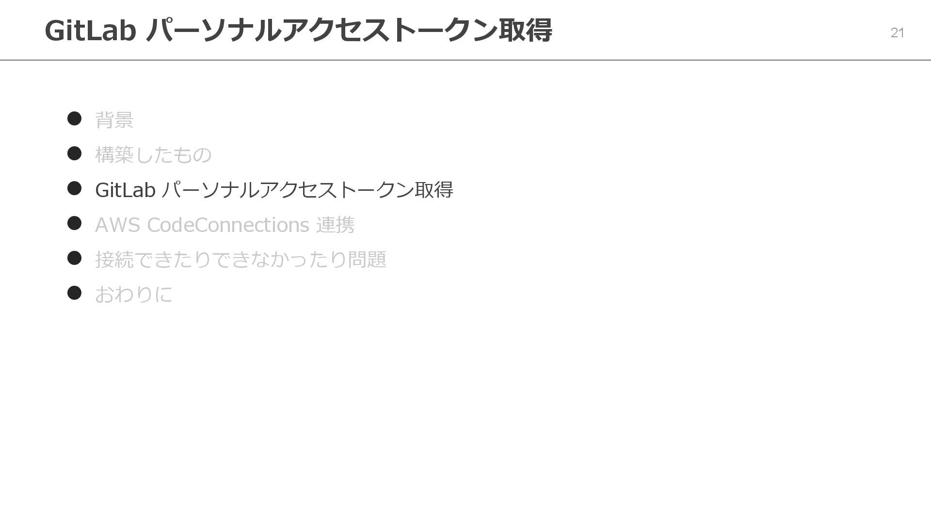 GitLab パーソナルアクセストークン取得 21 ⚫ 背景 ⚫ 構築したもの ⚫ GitLab パーソナルアクセストークン取得