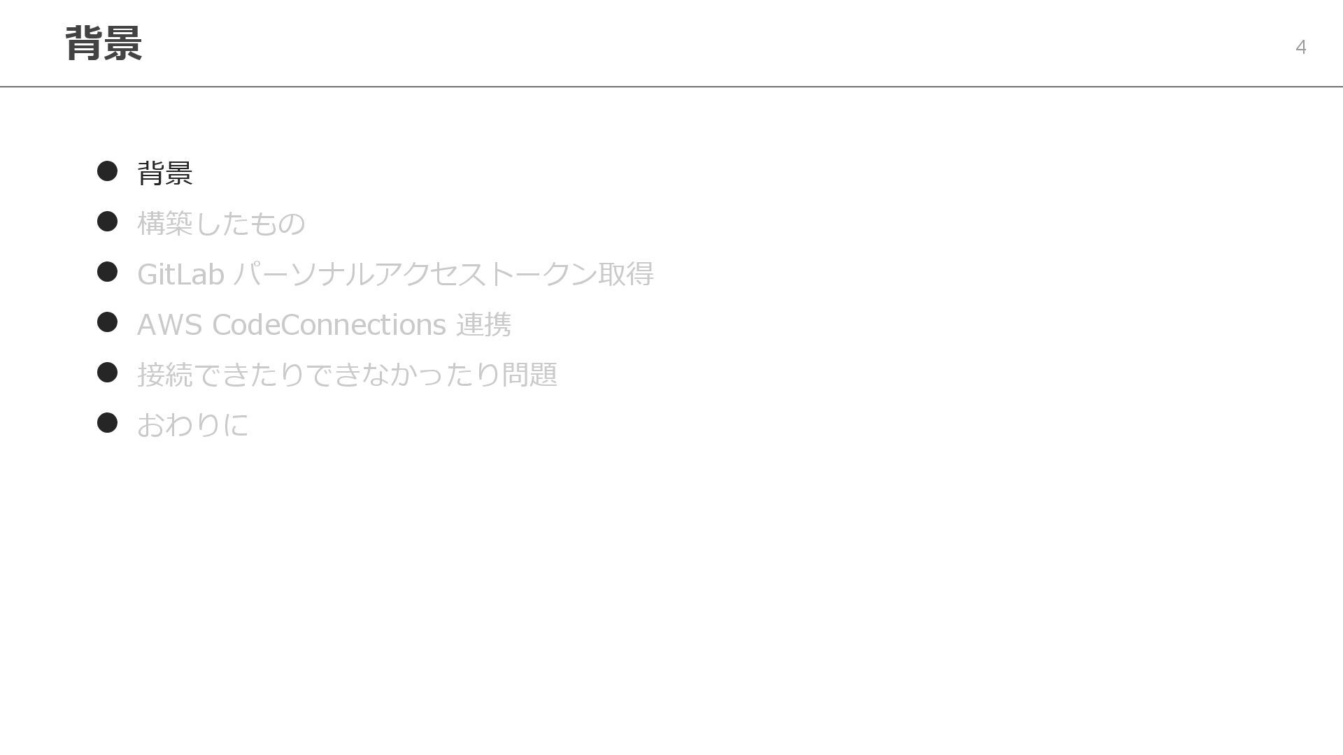 目次 3 ⚫ 背景 ⚫ 構築したもの ⚫ GitLab パーソナルアクセストークン取得 ⚫