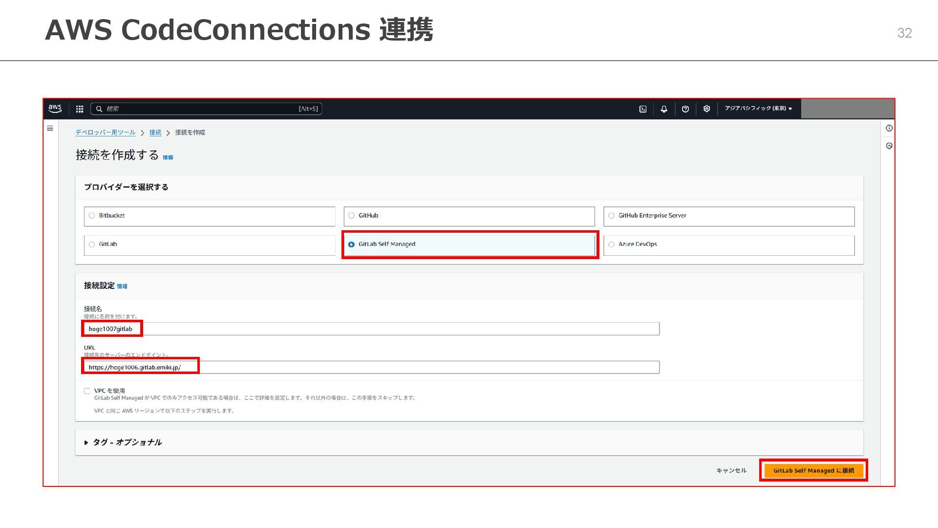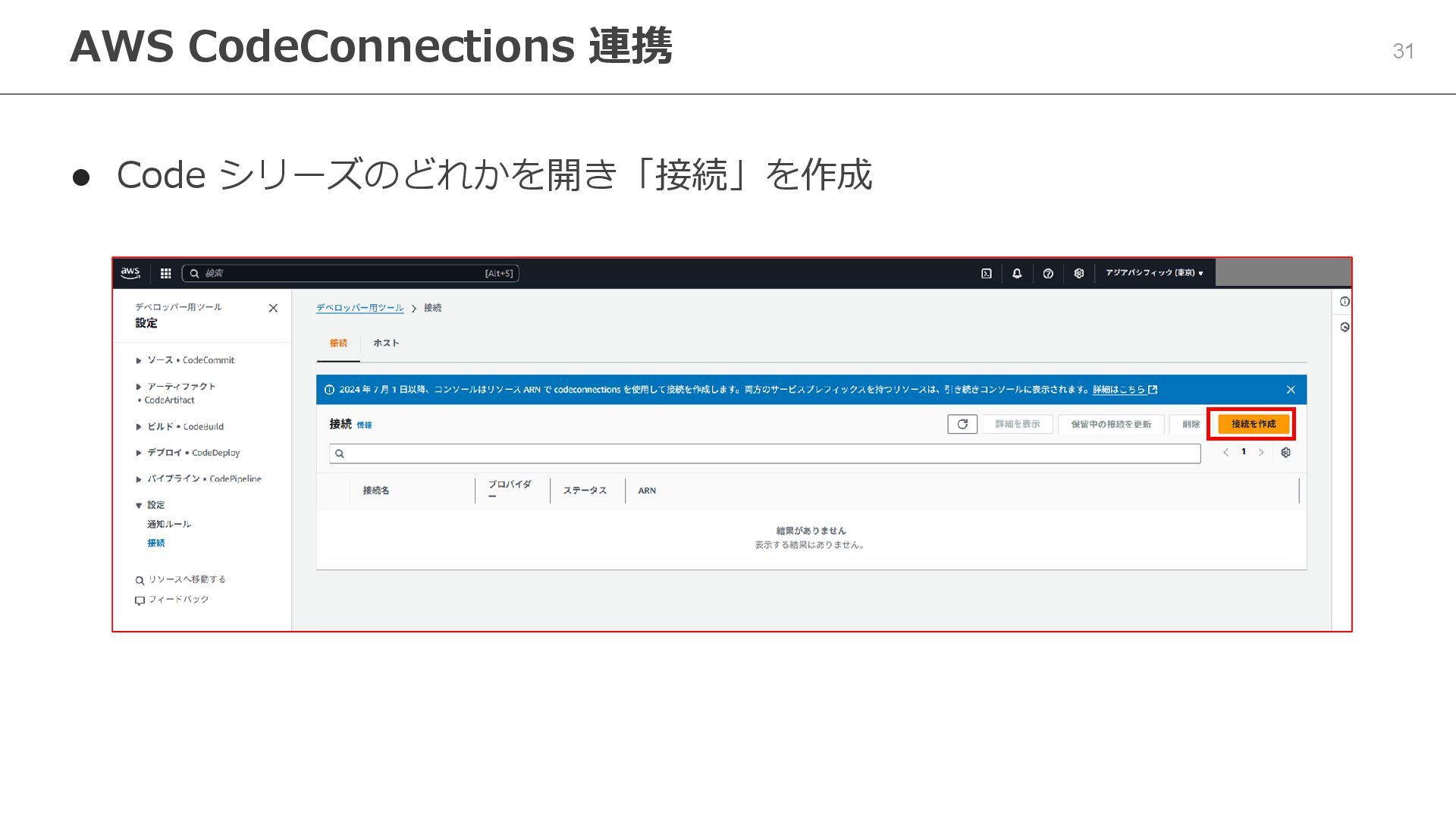 31 ⚫ Code シリーズのどれかを開き「接続」を作成 AWS CodeConnections 連携