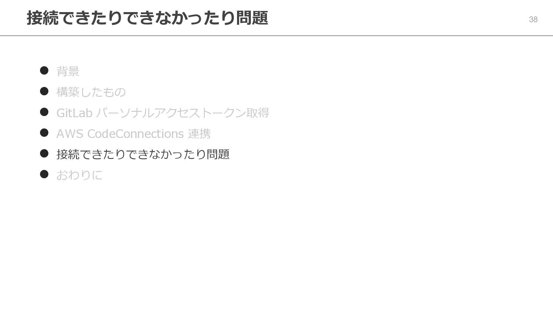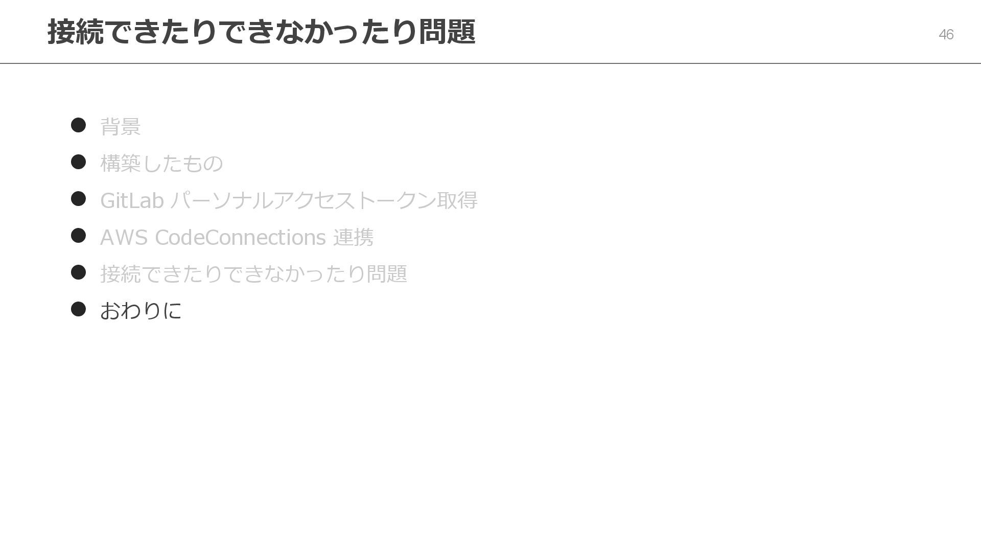 ⚫ AWS CodeConnections 連携 ⚫ 接続できたりできなかったり問題 ⚫ おわりに