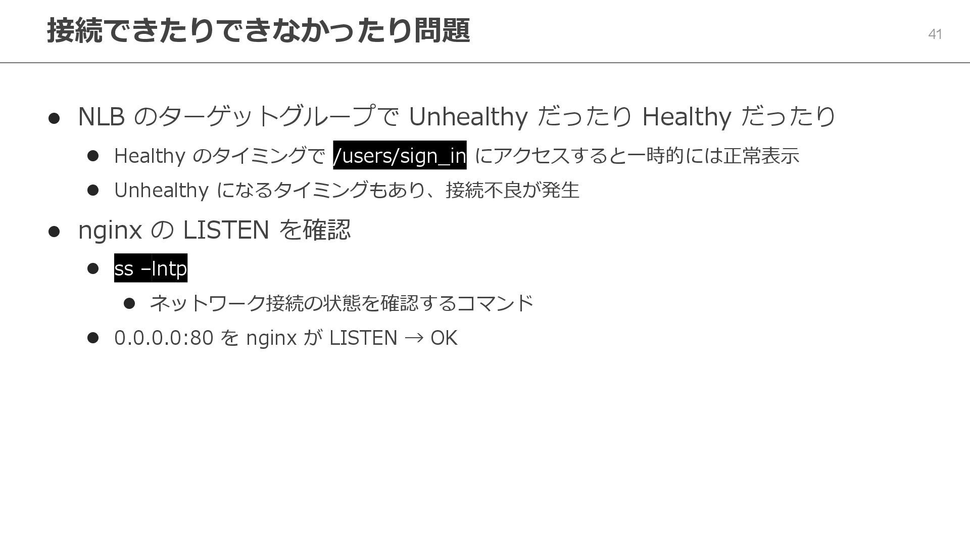 41 ⚫ NLB のターゲットグループで Unhealthy だったり Healthy だったり ⚫ Healthy