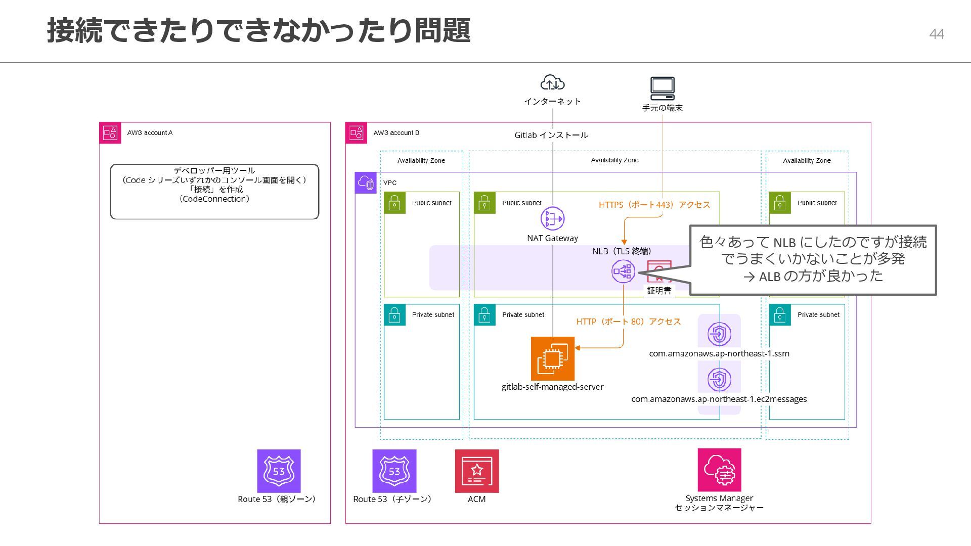 44 接続できたりできなかったり問題 色々あって NLB にしたのですが接続 でうまくいかないことが多発 → ALB の方が良かった