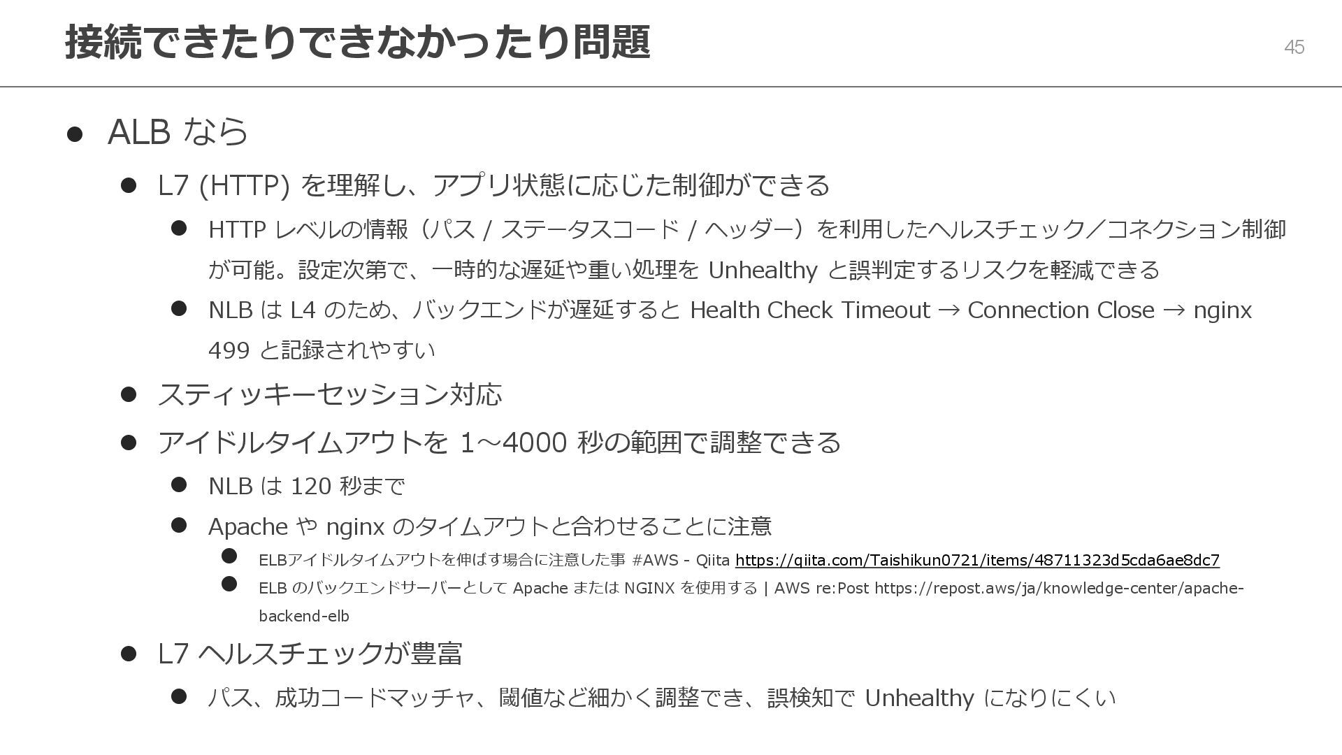 レベルの情報(パス / ステータスコード / ヘッダー)を利用したヘルスチェック/コネクション制御 が可能。設定次第で、一時的な遅延や重い処理を Unhealthy と誤判定するリスクを軽減できる ⚫ NLB は L4 のため、バックエンドが遅延すると Health Check Timeout → Connection Close → nginx 499 と記録されやすい ⚫ スティッキーセッション対応 ⚫ アイドルタイムアウトを 1~4000 秒の範囲で調整できる ⚫ NLB は 120 秒まで ⚫ Apache や nginx のタイムアウトと合わせることに注意 ⚫ ELBアイドルタイムアウトを伸ばす場合に注意した事 #AWS - Qiita https://qiita.com/Taishikun0721/items/48711323d5cda6ae8dc7 ⚫ ELB のバックエンドサーバーとして Apache または NGINX を使用する | AWS re:Post https://repost.aws/ja/knowledge-center/apache- backend-elb ⚫ L7 ヘルスチェックが豊富 ⚫ パス、成功コードマッチャ、閾値など細かく調整でき、誤検知で Unhealthy になりにくい 接続できたりできなかったり問題