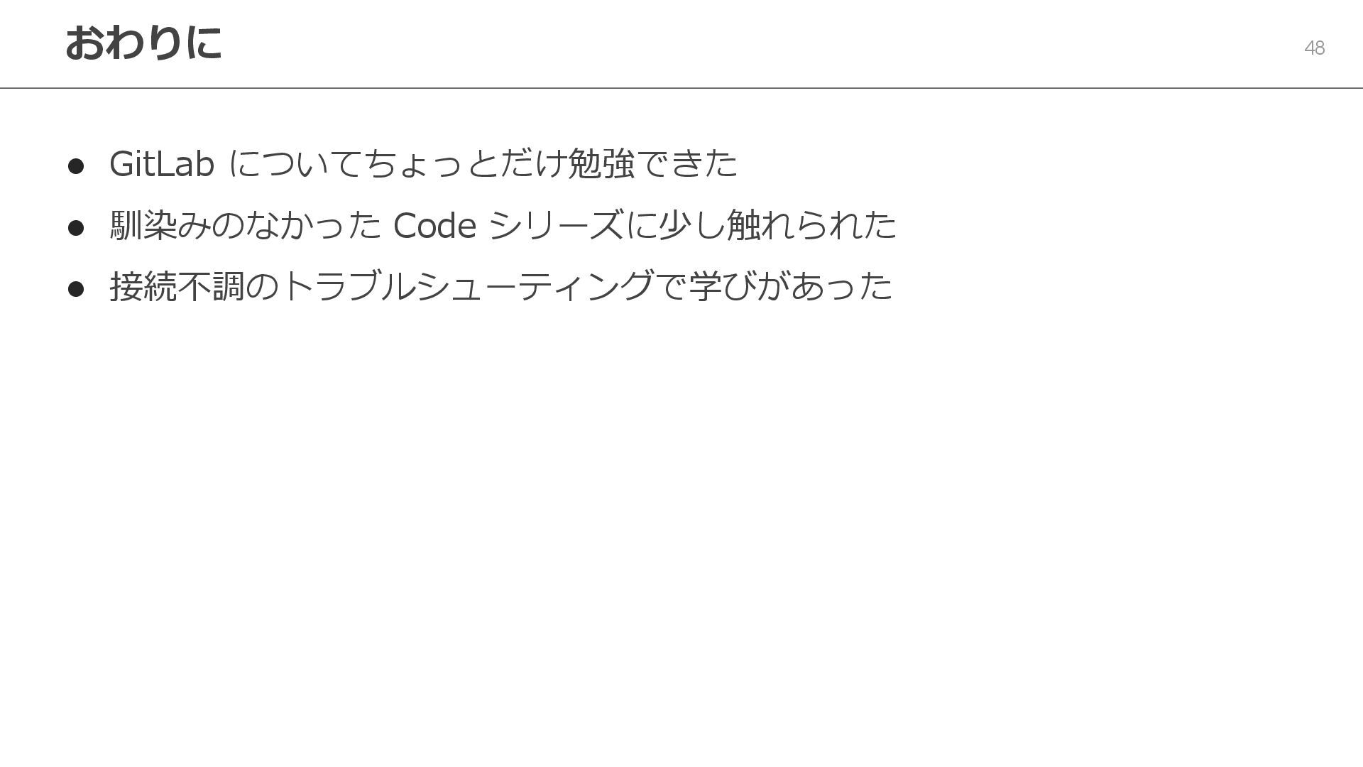 48 ⚫ GitLab についてちょっとだけ勉強できた ⚫ 馴染みのなかった Code シリーズに少し触れられた ⚫ 接続不調のトラブルシューティングで学びがあった