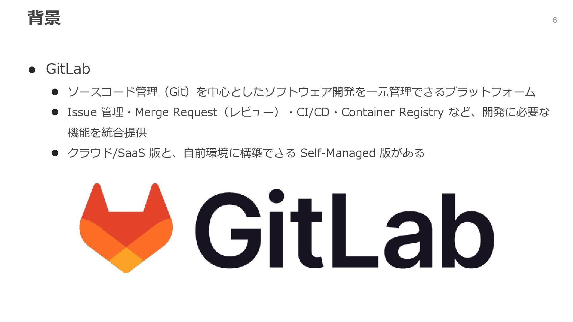 6 ⚫ GitLab ⚫ ソースコード管理(Git)を中心としたソフトウェア開発を一元管理できるプラットフォーム ⚫ Issue 管理・Merge Request(レビュー)・CI/CD・Container Registry
