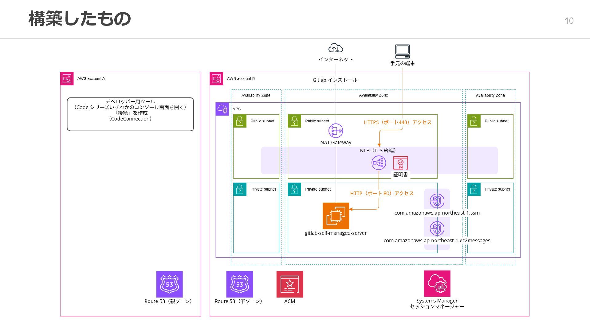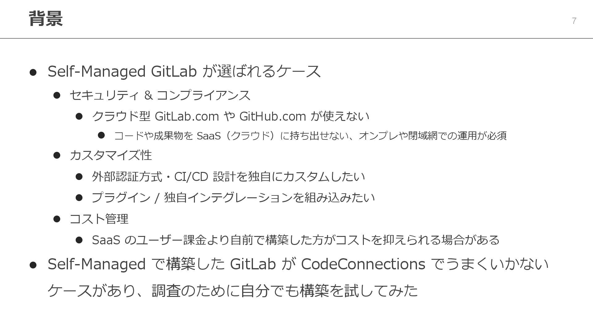 クラウド型 GitLab.com や GitHub.com が使えない ⚫ コードや成果物を SaaS(クラウド)に持ち出せない、オンプレや閉域網での運用が必須 ⚫ カスタマイズ性 ⚫ 外部認証方式・CI/CD 設計を独自にカスタムしたい ⚫ プラグイン / 独自インテグレーションを組み込みたい ⚫ コスト管理 ⚫ SaaS のユーザー課金より自前で構築した方がコストを抑えられる場合がある ⚫ Self-Managed で構築した GitLab が CodeConnections でうまくいかない ケースがあり、調査のために自分でも構築を試してみた 背景