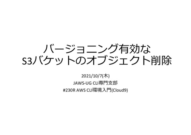 [ { "ETag": "¥"d41d8cd98f00b204e9800998ecf8427e¥"", "Size": 0, "StorageClass": "STANDARD", "Key": "folder1/", "VersionId": "OOVJiE5lBNPQ_AuNrlcGu8T0pBj8sNjp", "IsLatest": true, "LastModified": "2021-09-23T20:05:14.000Z", "Owner": { "DisplayName": "emixxxxxxxx", "ID": "" } }, { "ETag": "¥"d41d8cd98f00b204e9800998ecf8427e¥"", "Size": 0, "StorageClass": "STANDARD", "Key": "folder1/cli_test - コピー.txt", "VersionId": "NfCRi2U7m5DyZWQu0D3DnaGbmkzQaOrX", "IsLatest": true, "LastModified": "2021-09-23T20:06:15.000Z", "Owner": { "DisplayName": "emixxxxxxxx", "ID": "2772a153121e9cbe9581864de8f1361efbf95ad8dd8b78260" } }, { "ETag": "¥"d41d8cd98f00b204e9800998ecf8427e¥"", "Size": 0, "StorageClass": "STANDARD", "Key": "folder1/cli_test.txt", "VersionId": "cheFC4vtWokDYqTgkPtltszkZmg8HvVM", "IsLatest": true, "LastModified": "2021-09-23T20:06:15.000Z", "Owner": { "DisplayName": "emixxxxxxxx", "ID": "2772a153121e9cbe9581864de8f1361efbf95ad8dd8b7826009" } }, { "ETag": "¥"d41d8cd98f00b204e9800998ecf8427e¥"", "Size": 0, "StorageClass": "STANDARD", "Key": "folder2/", "VersionId": "O6U87cFpFSOiDuERWtfPF6hPnzvh9.Fw", "IsLatest": true, "LastModified": "2021-09-23T20:05:30.000Z", "Owner": { "DisplayName": "emixxxxxxxx", "ID": "2772a153121e9cbe9581864de8f1361efbf95ad8dd8b7826" } }, { "ETag": "¥"d41d8cd98f00b204e9800998ecf8427e¥"", "Size": 0, "StorageClass": "STANDARD", "Key": "folder2/cli_testxx.txt", "VersionId": "jIf_B6NsidsQQPiJ_lNRZHrkrulm6Ske", "IsLatest": false, "LastModified": "2021-09-23T20:06:30.000Z", "Owner": { "DisplayName": "emixxxxxxxx", "ID": "2772a153121e9cbe9581864de8f1361efbf95ad8dd8b7826" } }, { "ETag": "¥"d41d8cd98f00b204e9800998ecf8427e¥"", "Size": 0, "StorageClass": "STANDARD", "Key": "folder2/cli_testyy.txt", "VersionId": "wmYIzc8DqMObcus.EyH5WkVX1LxepO2l", "IsLatest": true, "LastModified": "2021-09-23T20:06:30.000Z", "Owner": { "DisplayName": "emixxxxxxxx", "ID": "2772a153121e9cbe9581864de8f1361efbf95ad8d" } }, { "ETag": "¥"d41d8cd98f00b204e9800998ecf8427e¥"", "Size": 0, "StorageClass": "STANDARD", "Key": "folder2/cli_testzz.txt", "VersionId": "ehTMB_gngE44z6Ygyo3MiATXKknndNbX", "IsLatest": true, "LastModified": "2021-09-23T20:06:30.000Z", "Owner": { "DisplayName": "emixxxxxxxx", "ID": "2772a153121e9cbe9581864de8f1361efbf95ad8dd8b782600" } }, { "ETag": "¥"d41d8cd98f00b204e9800998ecf8427e¥"", "Size": 0, "StorageClass": "STANDARD", "Key": "folder3/", "VersionId": "kqExb_gVDHJdxAK6WgU7P70uk2Jh_DlY", "IsLatest": false, "LastModified": "2021-09-23T20:05:36.000Z", "Owner": { "DisplayName": "emixxxxxxxx", "ID": "2772a153121e9cbe9581864de8f1361efbf95ad8dd8b782" } }, { "ETag": "¥"d41d8cd98f00b204e9800998ecf8427e¥"", "Size": 0, "StorageClass": "STANDARD", "Key": "folder3/cli_test98.txt", "VersionId": "AGVIuRnjfTPQbxI0Px77tQbE5niHhWyZ", "IsLatest": false, "LastModified": "2021-09-23T20:06:44.000Z", "Owner": { "DisplayName": "emixxxxxxxx", "ID": "2772a153121e9cbe9581864de8f1361efbf95ad8dd8b78260" } }, { "ETag": "¥"d41d8cd98f00b204e9800998ecf8427e¥"", "Size": 0, "StorageClass": "STANDARD", "Key": "folder3/cli_test99.txt", "VersionId": "NWmHhxn2VJAeTFocapox5_a_qEYbgsvt", "IsLatest": false, "LastModified": "2021-09-23T20:06:44.000Z", "Owner": { "DisplayName": "emixxxxxxxx", "ID": "2772a153121e9cbe9581864de8f1361efbf95ad8dd8b78260" } }, { "ETag": "¥"d41d8cd98f00b204e9800998ecf8427e¥"", "Size": 0, "StorageClass": "STANDARD", "Key": "test1.txt", "VersionId": "yjatJyJdz1WtMrqwv7GVEiukkxG8MHB9", "IsLatest": false, "LastModified": "2021-09-23T20:05:59.000Z", "Owner": { "DisplayName": "emixxxxxxxx", "ID": "2772a153121e9cbe9581864de8f1361efbf95ad8dd8b78" } }, { "ETag": "¥"d41d8cd98f00b204e9800998ecf8427e¥"", "Size": 0, "StorageClass": "STANDARD", "Key": "test2.txt", "VersionId": "o4oWEwvo_2P_c9_WCBrS.wSE5jguevMV", "IsLatest": true, "LastModified": "2021-09-23T20:05:59.000Z", "Owner": { "DisplayName": "emixxxxxxxx", "ID": "2772a153121e9cbe9581864de8f1361efbf95ad8d" } } ], "DeleteMarkers": [ { "Owner": { "DisplayName": "emixxxxxxxx", "ID": "2772a153121e9cbe9581864de8f1361efbf95" }, "Key": "folder2/cli_testxx.txt", "VersionId": "DuYgTonHE9aaHL2t0NJlI0WMB3aSau09", "IsLatest": true, "LastModified": "2021-09-23T20:07:23.000Z" }, { "Owner": { "DisplayName": "emixxxxxxxx", "ID": "2772a153121e9cbe9581864de8f1361efbf95ad8dd8b78260096d9a55e36c3f3" }, "Key": "folder3/cli_test98.txt", "VersionId": "IKhFzixbzCVFyOocNf58bboDBBESbnuK", "IsLatest": true, "LastModified": "2021-09-23T20:07:40.000Z" }, { "Owner": { "DisplayName": "emixxxxxxxx", "ID": "2772a153121e9cbe9581864de8f1361efbf95ad8dd8b78260096d9a55e36c3f3" }, "Key": "folder3/cli_test99.txt", "VersionId": "hpQ0ox92OeI7xSLOPL5gtvD5WM_ko45S", "IsLatest": true, "LastModified": "2021-09-23T20:07:40.000Z" }, { "Owner": { "DisplayName": "emixxxxxxxx", 8b78260096d9a55e36c3f3 "ID": "2772a153121e9cbe9581864de8f1361efbf95ad8dd" }, "Key": "test1.txt", "VersionId": "vM7BCcSGEZIDnhiT9h13OBECX.zE0tPZ", "IsLatest": true, "LastModified": "2021-09-23T20:06:59.000Z" } ] } [ec2-user@ip-10-0-0-31%]$ オブジェクトのバージョンIDを取得 • 要素を見ていくと Versionsセクション DeleteMarkers セクション