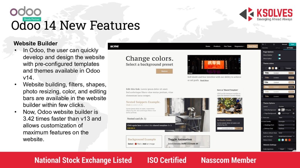 Now, Odoo website builder is 3.42 times faster than v13 and allows customization of maximum features on the website.