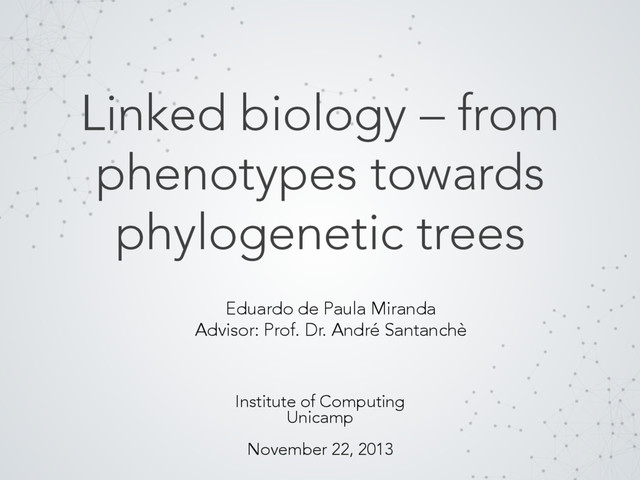 Proceedings of the 6th Seminar on Ontology Research in Brazil, volume 1041, pages 154 – 165, September 2013. • Coupling phenotype descriptions and phylogenetic trees: from SDD to ontologies via graph databases. Talk at TDWG 2013 Annual Conference Florence, Italy, 28th of October – 1st of November 2013.