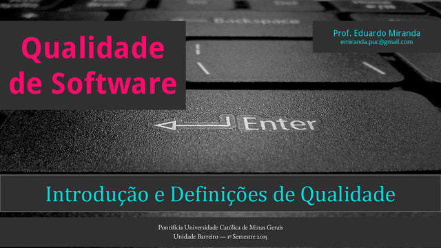 Slides utilizados em aula na disciplina Qualidade de Software do Instituto de Ciências Exatas e Informática - Sistemas de Informação. Pontifícia Universidade Católica de Minas Gerais - Unidade Barreiro, 1º Semestre 2015.