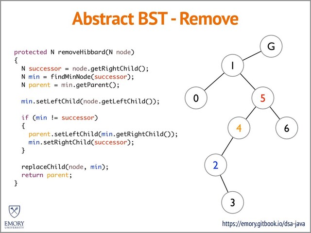 N removeHibbard(N node) { N successor = node.getRightChild(); N min = findMinNode(successor); N parent = min.getParent(); min.setLeftChild(node.getLeftChild()); if (min != successor) { parent.setLeftChild(min.getRightChild()); min.setRightChild(successor); } replaceChild(node, min); return parent; } 3 G 0 2