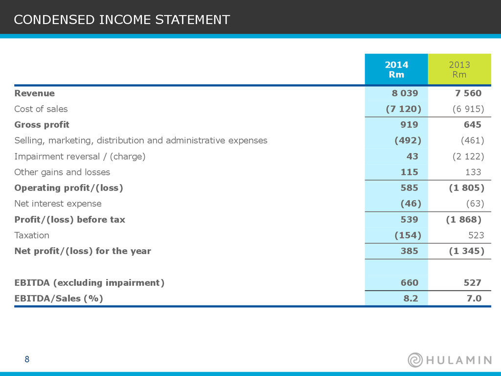 1. An excellent aluminium semi-fabricator • 220 000 tons ROLLED PRODUCTS, light gauge can stock mix • Niche focus, high value product streams • Customer driven – lift quality and OTD • Optimise product and market mix for profit • Safety is non negotiable 2. Globally cost competitive • Competitive employee complement • Natural gas supply close to world prices • 25% of metal from recycled sources • Raise recoveries and lower waste • Build a performance culture through leadership development • Key technical skills and engaged workforce • Gas supply and cost risk – DJP with CNG • Minimise impact of load shedding • New AR facility ramp up in Q3 3. Growing regional sales, but focus on mix optimisation • Rapid regional can stock, automotive, infrastructure led growth to 2020 • Build on our strong SA beverage can base • Increase competency in auto heat exchangers • Exit non-performing product streams • Promote aluminium in SA auto & other industries • Help grow Isizinda “The Hub” 4. Secure a competitive metal supply • Hillside, Bayside and recycled metal • Bayside transaction is a big rock moved • Broaden downstream beneficiator base through Isizinda • Raise the profile of recycling and the SA aluminium industry • Look to increase recycling capacity 5. Cooperative regulatory environment • Imports - level playing field • Ongoing demand side support, scrap export restrictions • Inward investment and incentives • Duty application lodged with ITAC • Partnering with DTI on auto industry development • Ensure benefits of favourable treaties e.g. AGOA appreciated • Develop a balanced “Carbon Strategy”