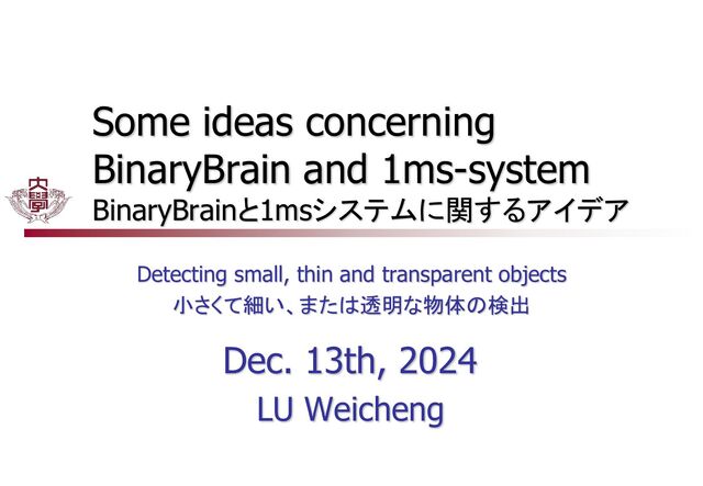 source utilization. ◼ Faster and more complex mission can be done in scenario which hardware resource is restricted. If I use BinaryBrain…… ◼ Suitable for scenarios with limited hardware resources, such as small embedded devices. ハードウェア資源が制限されているシナリオに適しており、 小型の組み込み機器などに適用できます。