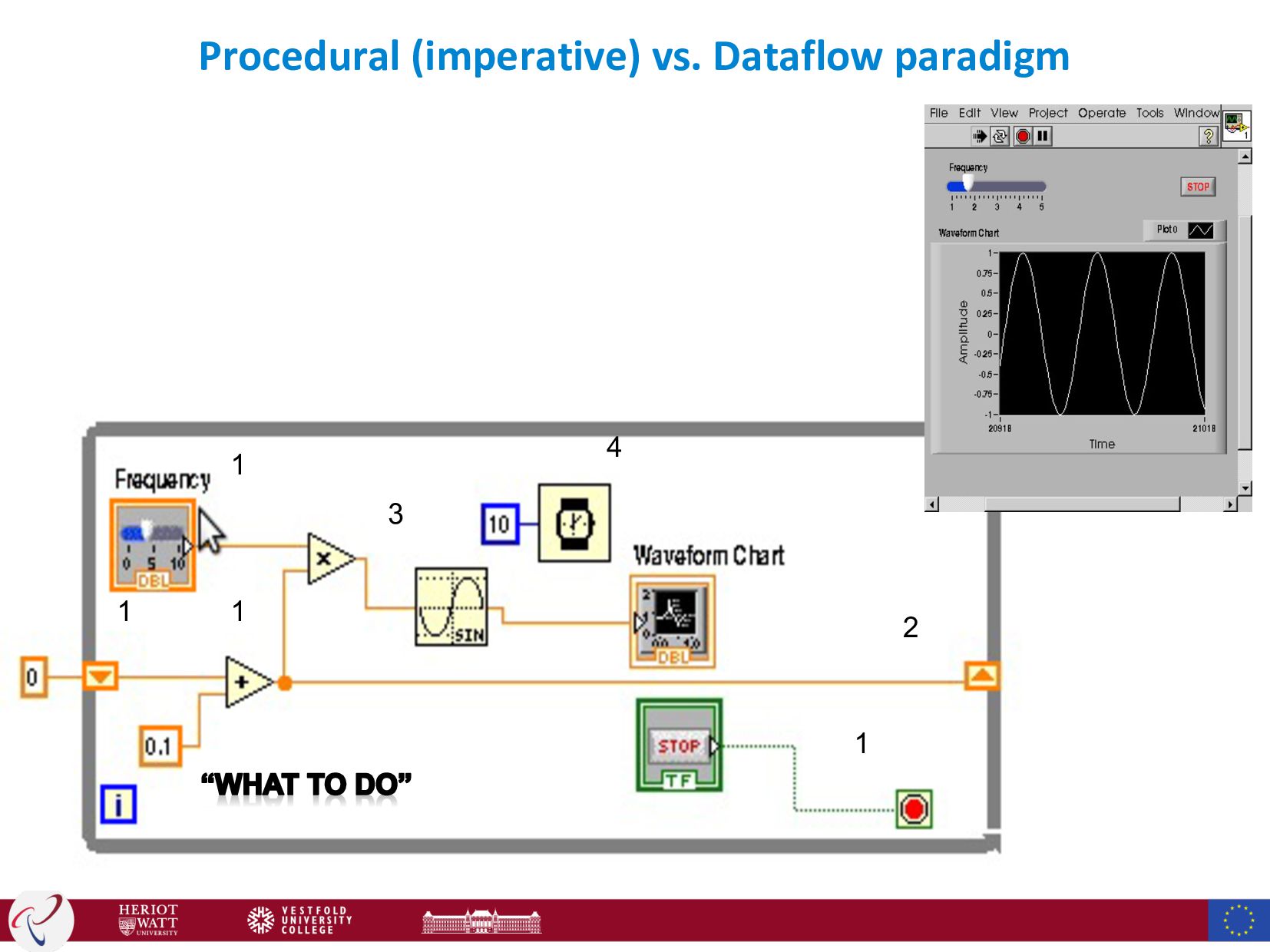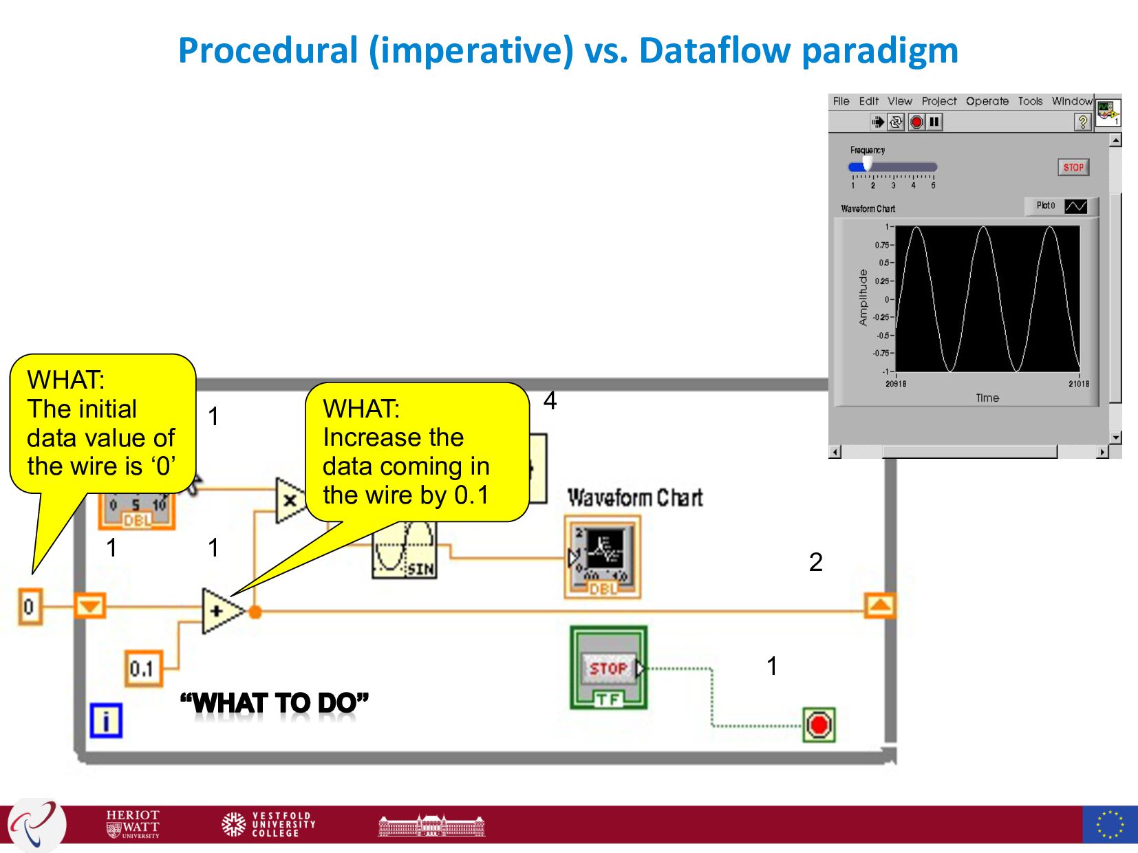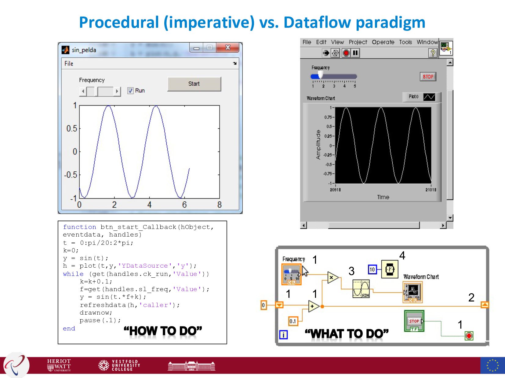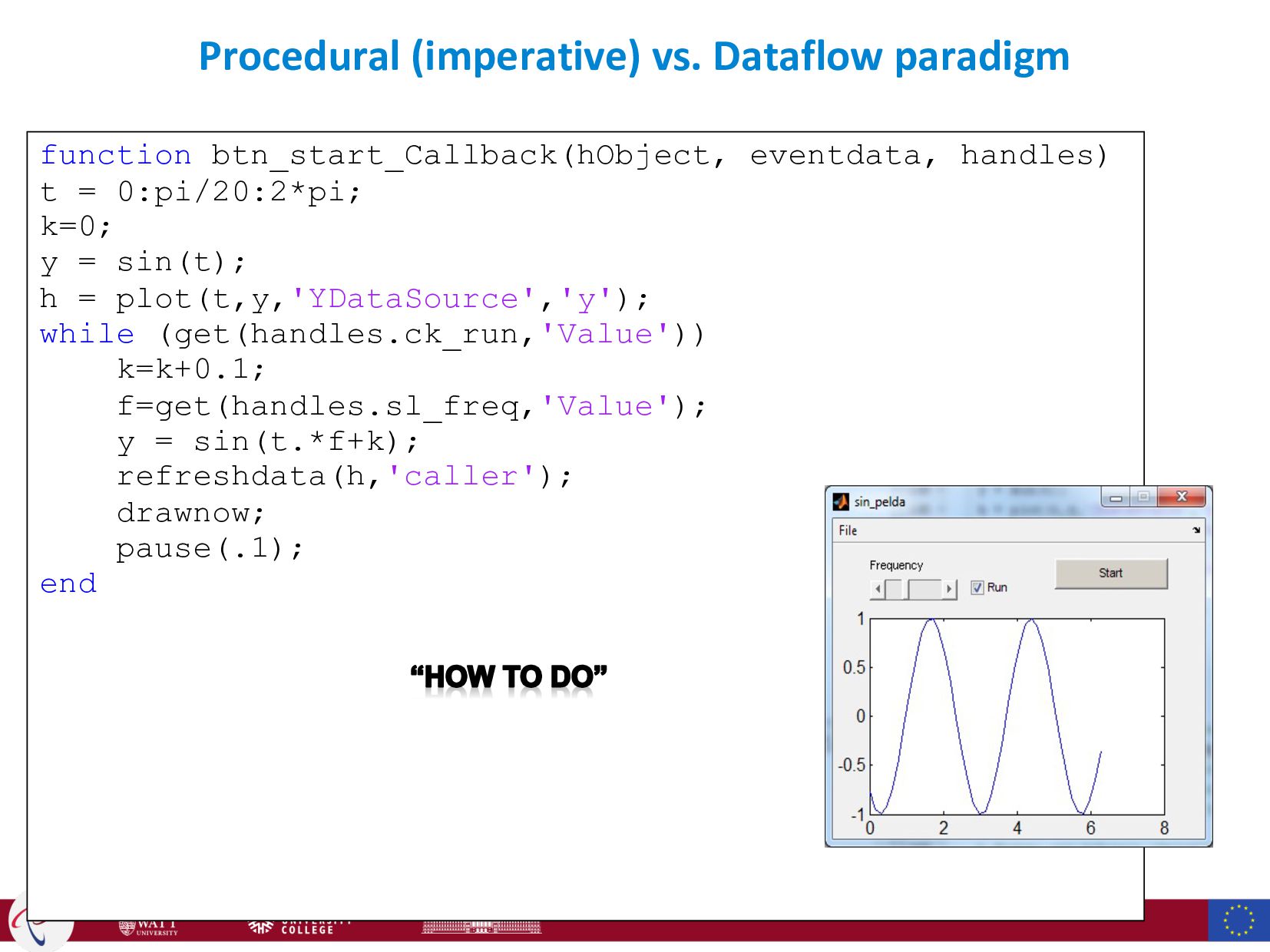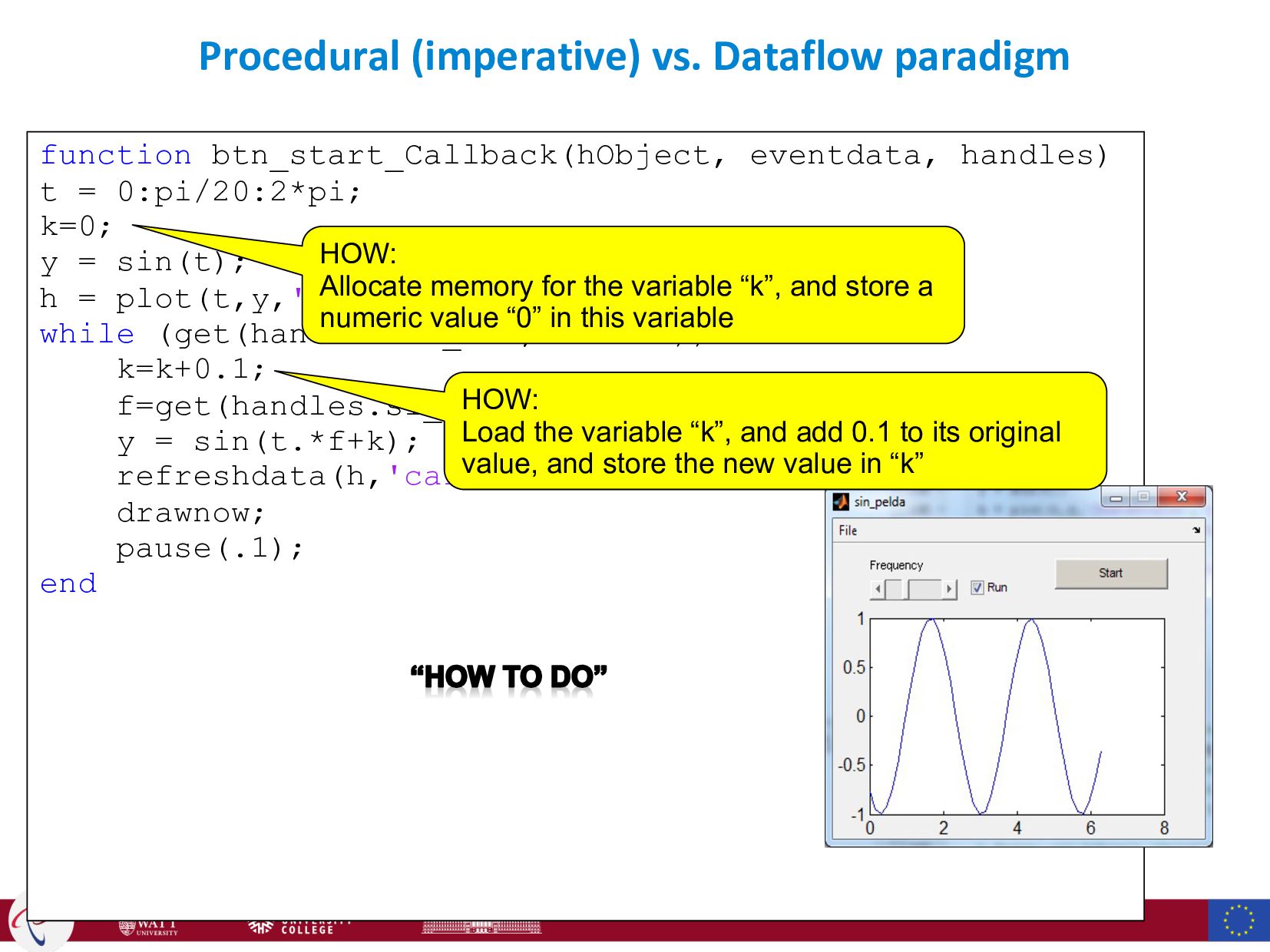 = 0:pi/20:2*pi; k=0; y = sin(t); h = plot(t,y,'YDataSource','y'); while (get(handles.ck_run,'Value')) k=k+0.1; f=get(handles.sl_freq,'Value'); y = sin(t.*f+k); refreshdata(h,'caller'); drawnow; pause(.1); end HOW: Allocate memory for the variable “k”, and store a numeric value “0” in this variable HOW: Load the variable “k”, and add 0.1 to its original value, and store the new value in “k”