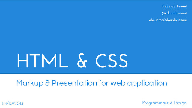 strong, em, span Gli elementi permettono di definire gli oggetti Attributes: href="http://about.com", title="Edoardo Tenani" Gli attributi aggiungono informazioni agli elementi Tag: <div id="fullname" class="name first last"></div> Una tag è l'unione di un elemento e i suoi attributi
