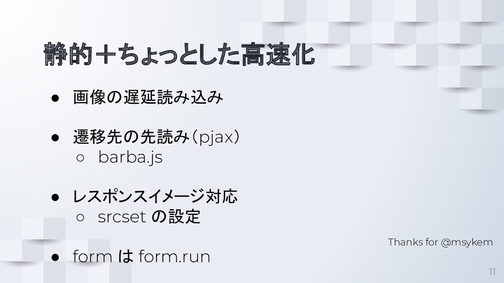 静的+ちょっとした高速化 11 • 画像の遅延読み込み • 遷移先の先読み(pjax) ◦ barba.js • レスポンスイメージ対応