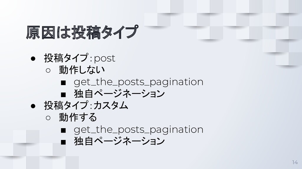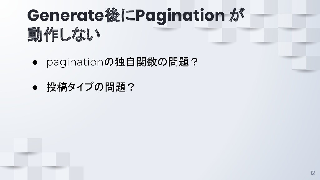 Generate後にPagination が 動作しない 12 • paginationの独自関数の問題? • 投稿タイプの問題?