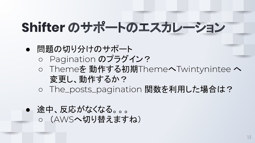 Shifter のサポートのエスカレーション 13 • 問題の切り分けのサポート ◦ Pagination のプラグイン? ◦ Themeを