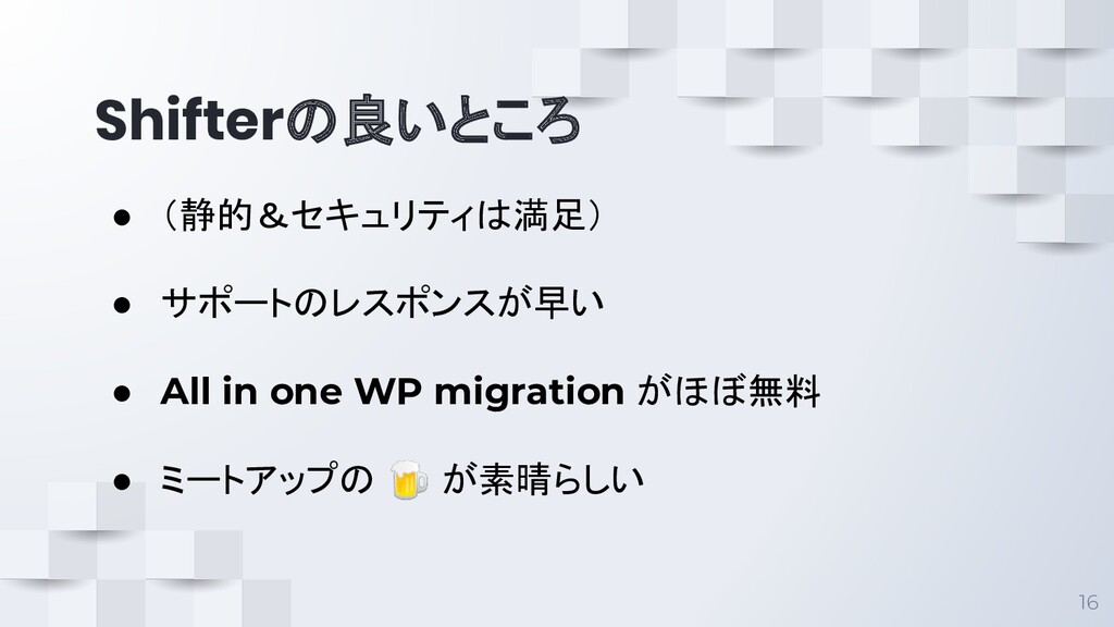 Shifterの良いところ 16 • (静的&セキュリティは満足) • サポートのレスポンスが早い • All in one