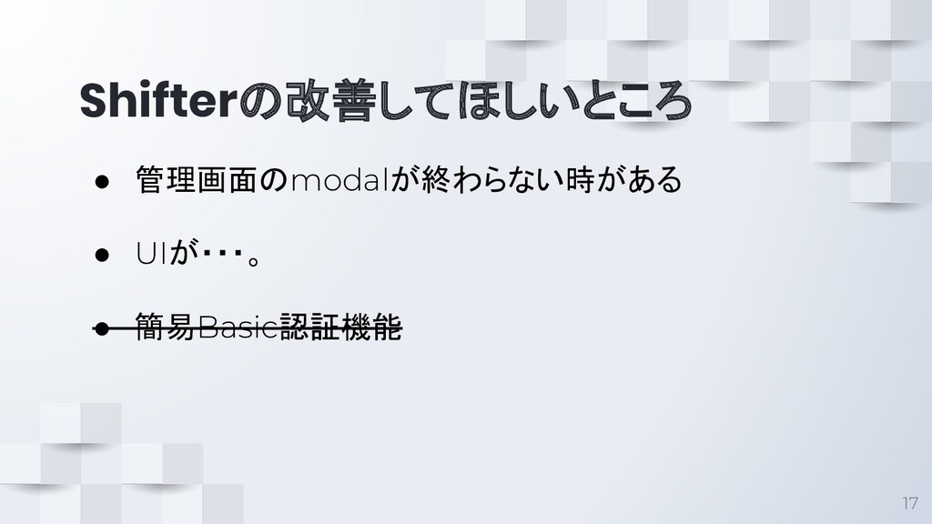 Shifterの改善してほしいところ 17 • 管理画面のmodalが終わらない時がある • UIが・・・。 • 簡易Basic認証機能