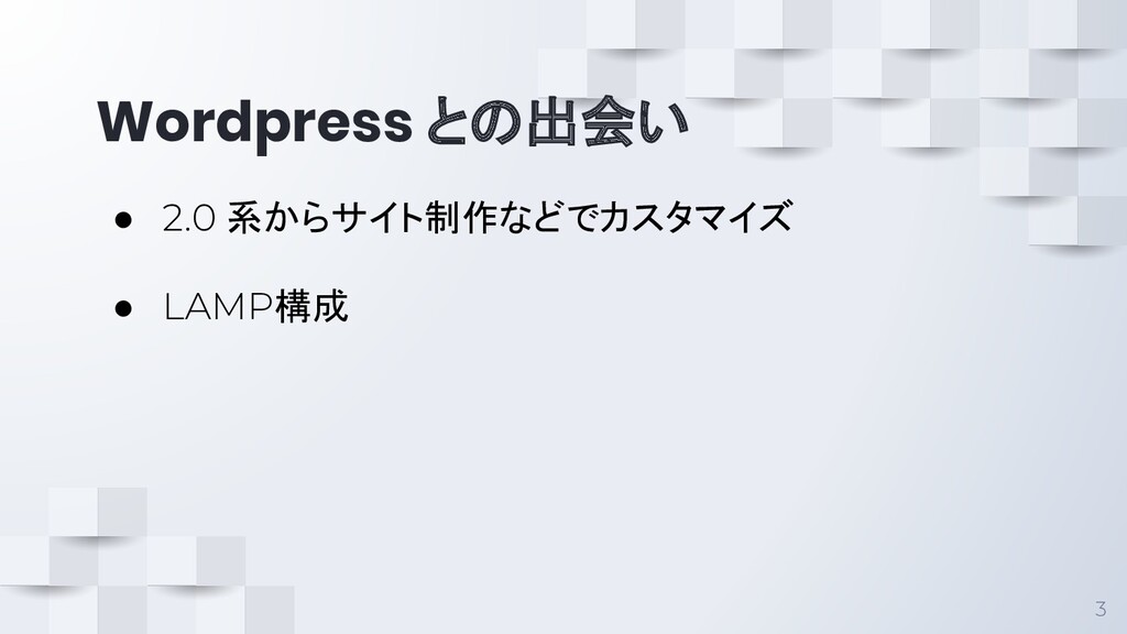 Wordpress との出会い 3 • 2.0 系からサイト制作などでカスタマイズ • LAMP構成