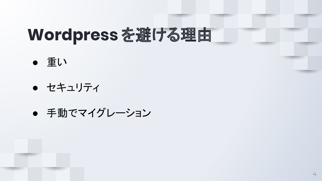 Wordpress を避ける理由 4 • 重い • セキュリティ • 手動でマイグレーション