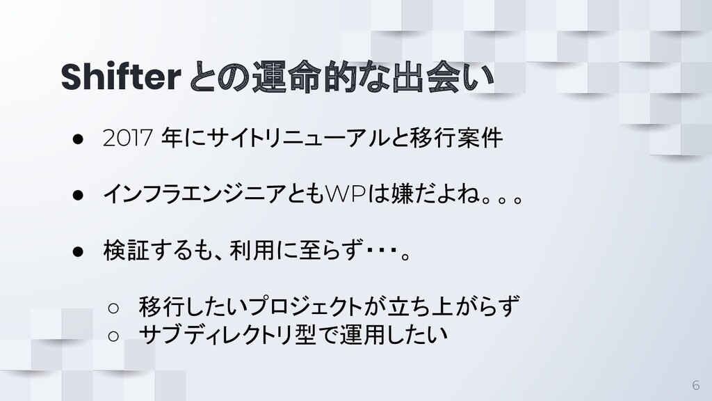 Shifter との運命的な出会い 6 • 2017 年にサイトリニューアルと移行案件 • インフラエンジニアともWPは嫌だよね。。。 • 検証するも、利用に至らず・・・。