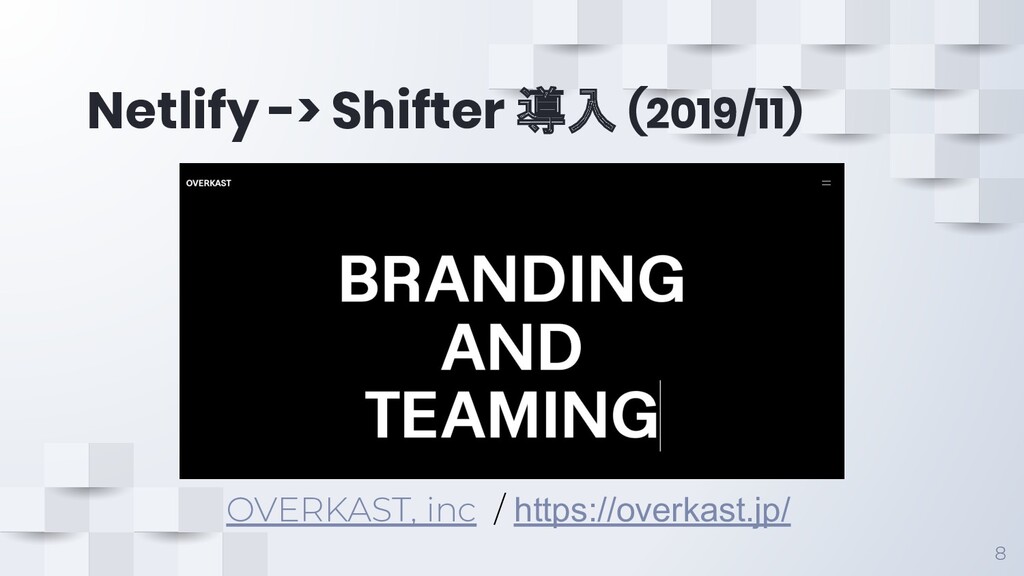 Netlify -> Shifter 導入 (2019/11) 8 OVERKAST, inc / https://overkast.jp/