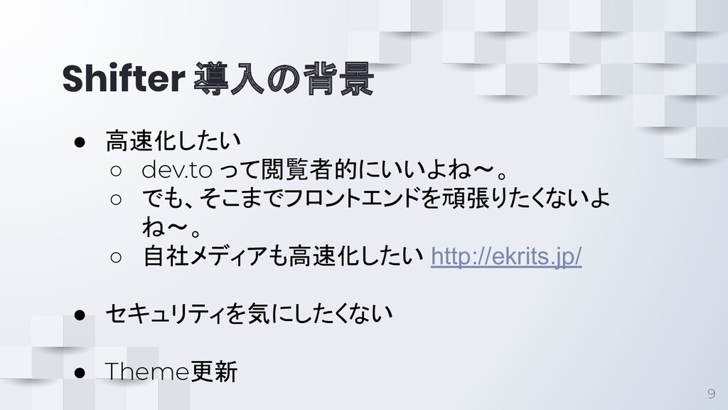 Shifter 導入の背景 9 • 高速化したい ◦ dev.to って閲覧者的にいいよね〜。 ◦ でも、そこまでフロントエンドを頑張りたくないよ