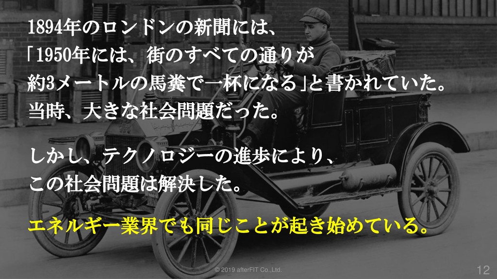 © 2019 afterFIT Co.,Ltd. 11 1894年のロンドンの新聞には、 「1950年には、街のすべての通りが 約3メートルの馬糞で一杯になる」と書かれていた。 当時、大きな社会問題だった。 しかし、テクノロジーの進歩により、