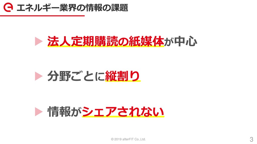 © 2019 afterFIT Co.,Ltd. 3 エネルギー業界の情報の課題 ▶ 法人定期購読の紙媒体が中心 ▶ 分野ごとに縦割り