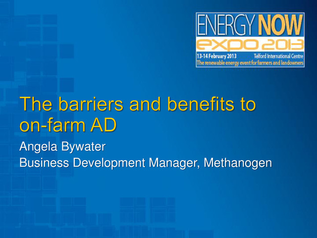 ‘waste’ legislation • Planning – varies from encouraging to obstructive across the country • Funding – GIB not interested; ‘small’ projects • Grid connection complexity, bureaucracy and cost • Capital cost of the technology – suppliers have to pass on the financial burden of low turnover, input to planning applications, input to financial proposals, feasibility studies, licensing and projects which do not come to fruition for any of these reasons. CDM and associated costs for ‘industrial’ processes. • Lack of stakeholder awareness of small/appropriate farm-scale AD – merchant plants, food waste, waste sector lobbying, eg Defra strategy document