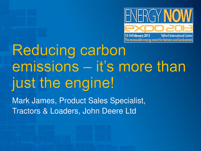 A wider focus than just the engine is needed to reduce emissions & increase fuel efficiency on complex machinery. • Ancilliary & accessory systems offer plenty of scope for optimization & efficiency gain. • New technologies are in the pipeline that will have a HUGE impact on emissions from farm equipment! •BUT REMEMBER – other factors can also conspire to reduce efficiency or increase emissions – including: • Working conditions • Operational factors • Implement settings • Tyres, ballasting & wheelslip PLUS MANY MORE