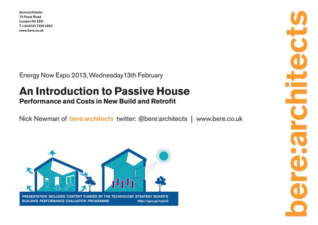 4503 www.bere.co.uk Energy Now Expo 2013, Wednesday13th February An Introduction to Passive House Performance and Costs in New Build and Retrofit Nick Newman of twitter: @bere:architects | www.bere.co.uk PRESENTATION INCLUDES CONTENT FUNDED BY THE TECHNOLOGY STRATEGY BOARD’S BUILDING PERFORMANCE EVALUATION PROGRAMME http://goo.gl/ny5vG