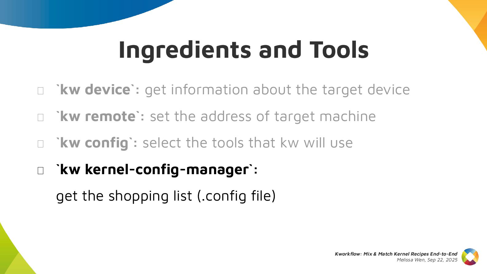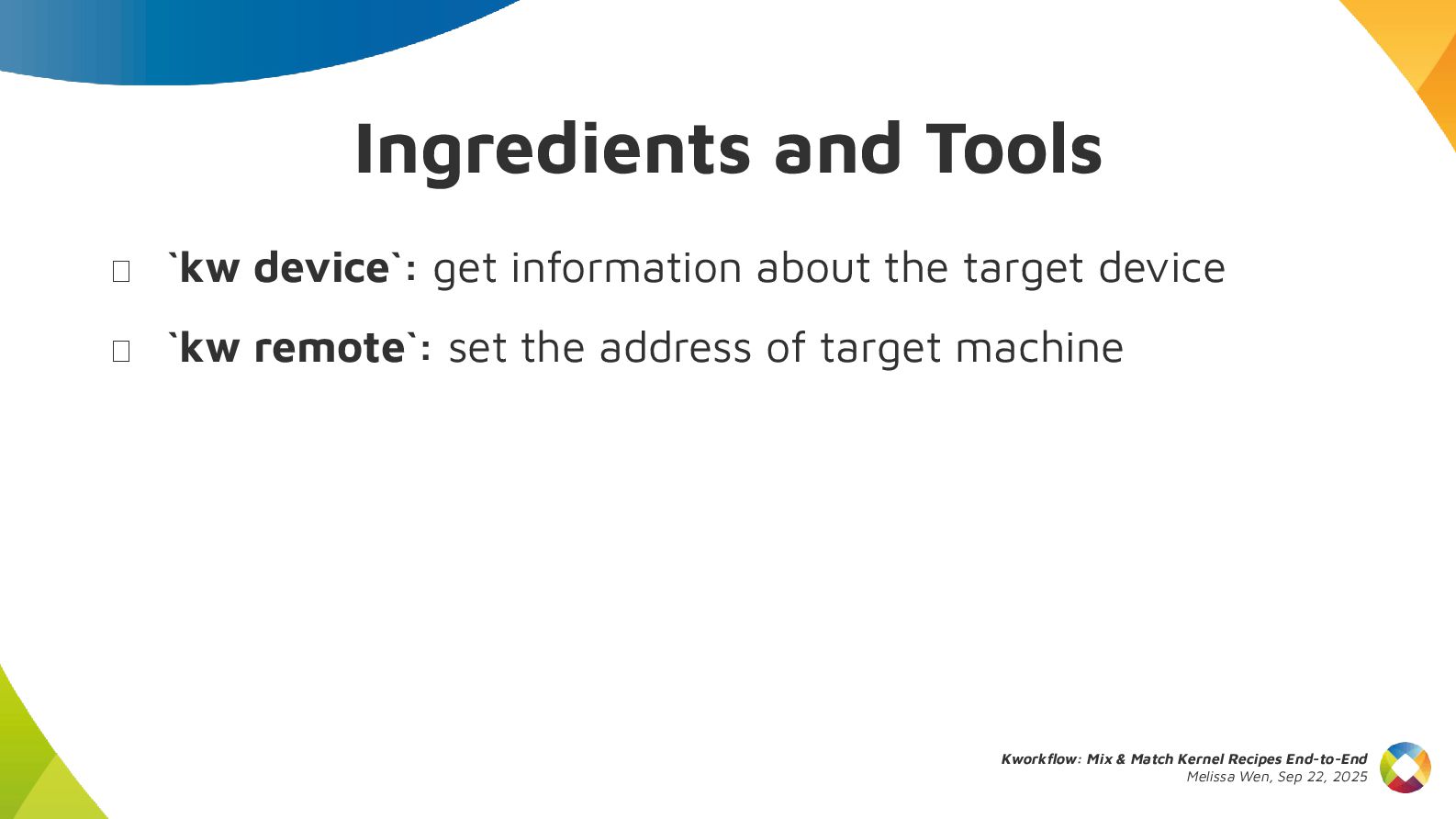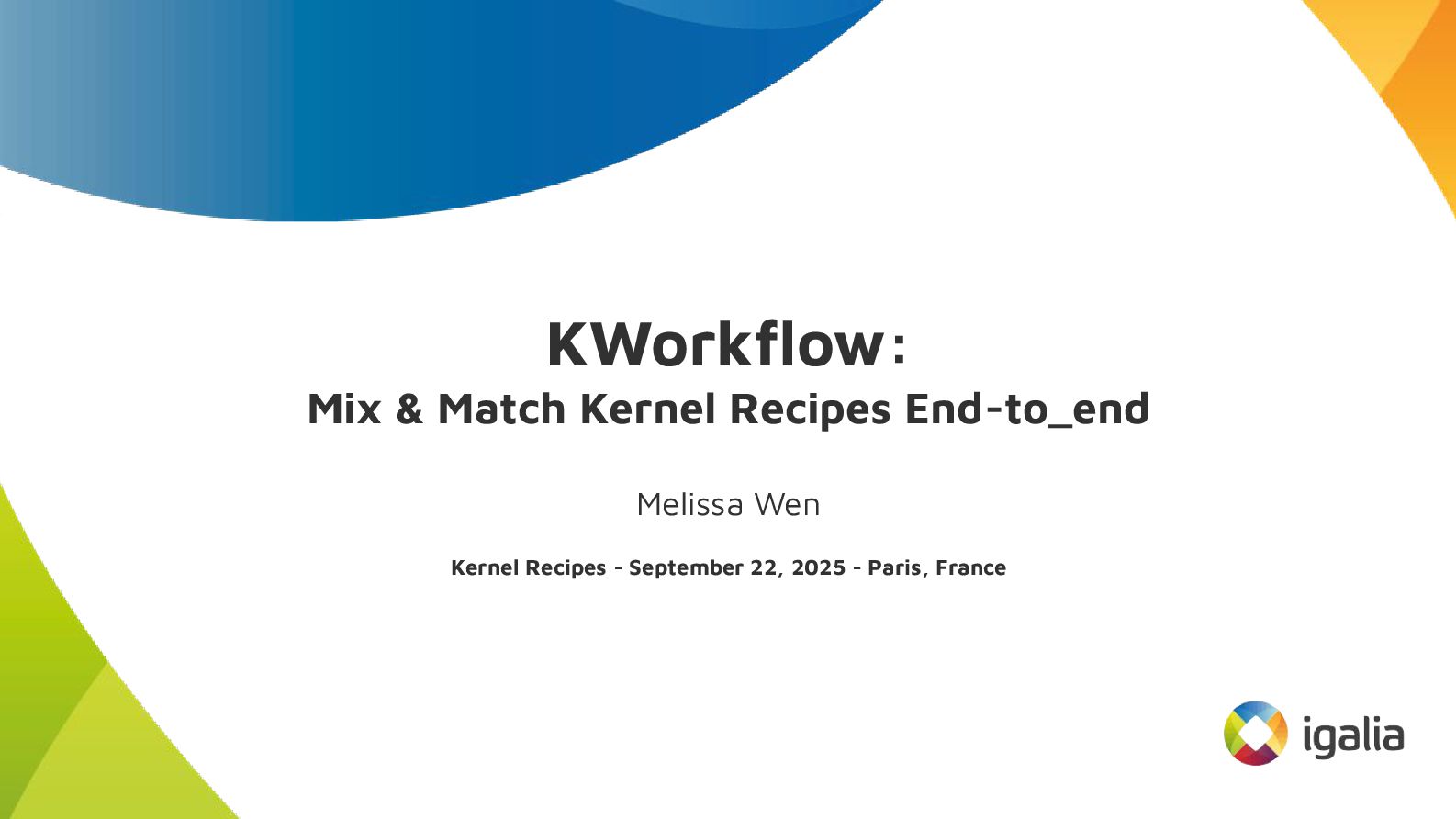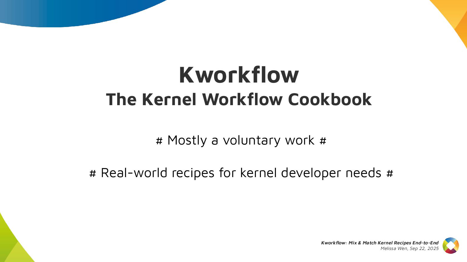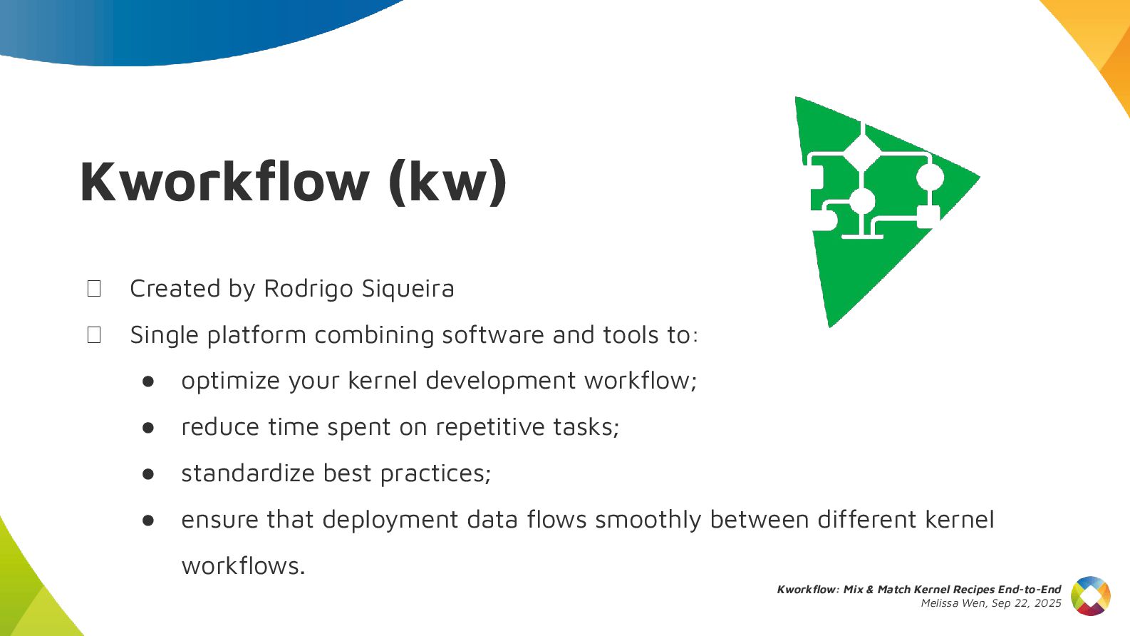 This talk introduces kw, a project designed to optimize your kernel workflow, automate common practices, and standardize data exchange. By consolidating valuable tools, scripts and recipes from the kernel community, kw aims to boost efficiency and collaboration.
