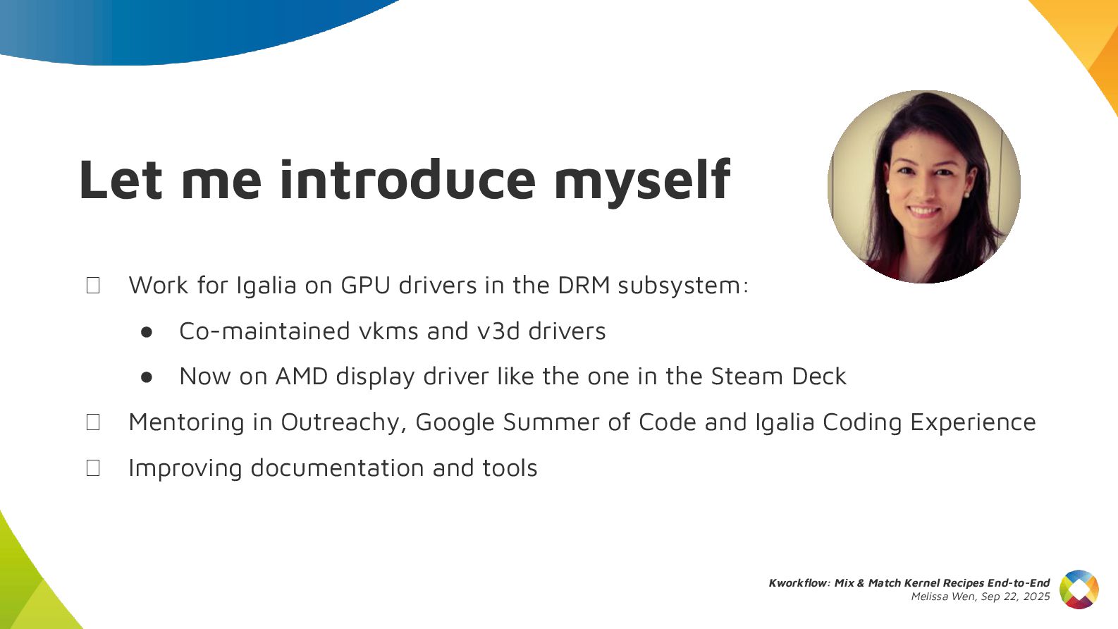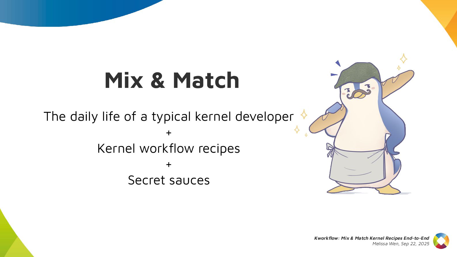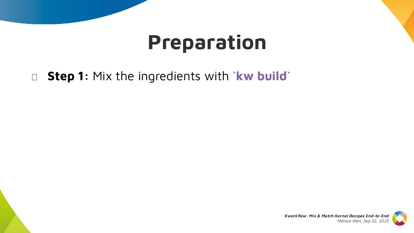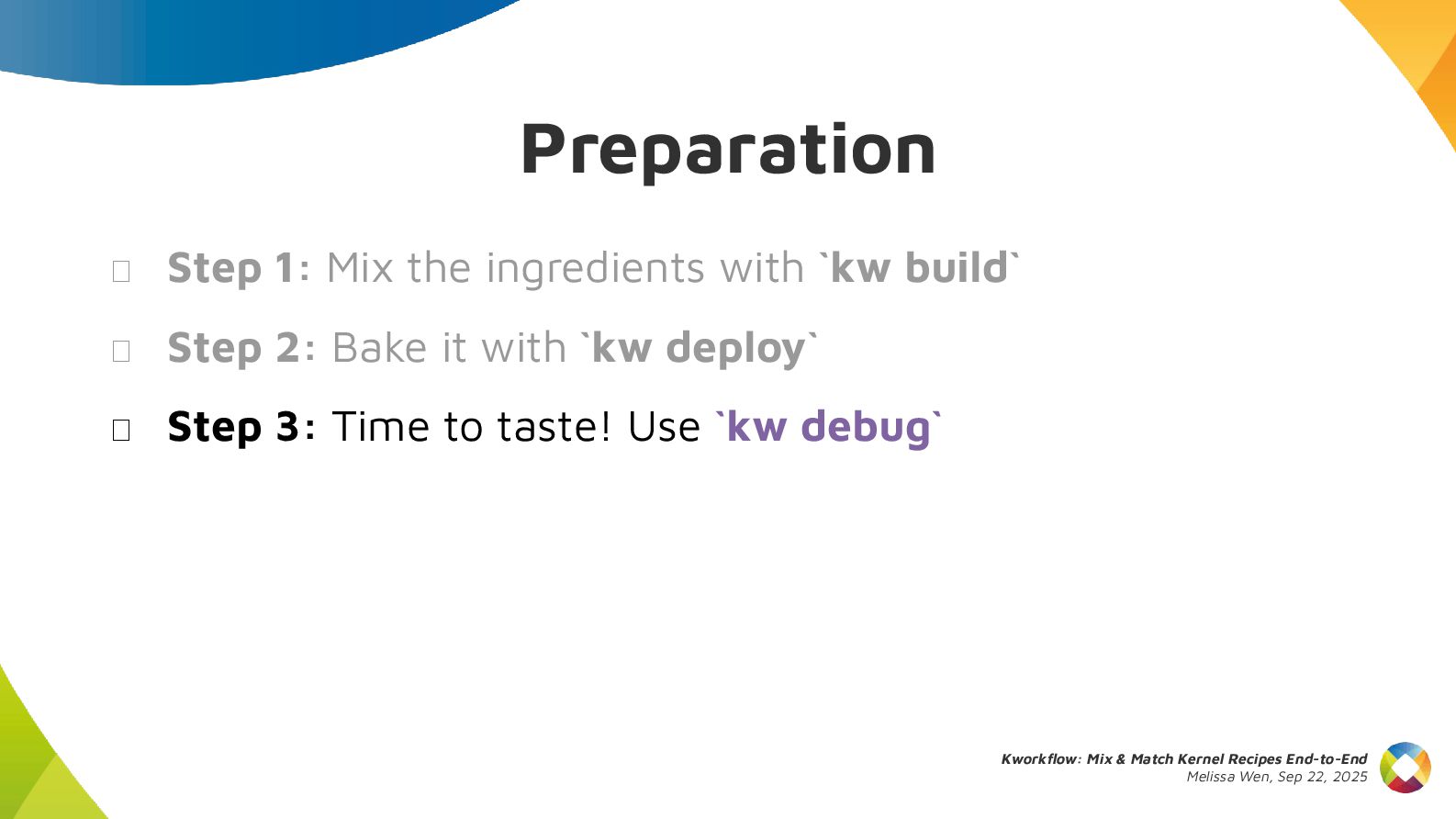 This talk introduces kw, a project designed to optimize your kernel workflow, automate common practices, and standardize data exchange. By consolidating valuable tools, scripts and recipes from the kernel community, kw aims to boost efficiency and collaboration.