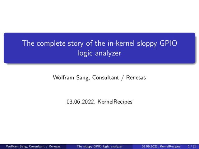 You know the rules, right? You should not implement a logic analyzer in software because equidistant sampling points cannot be guaranteed. You should also not disable interrupts in your kernel code, and if you really need to, it should be as short as possible. And surely you should not allow userspace to allocate memory without any constraints. Now, one big joy with hacking is breaking such rules and go wild. Listen to Wolfram’s story about the sloppy GPIO logic analyzer. How it started as an internal tool to debug a remote system and evolved into something which is making its way to mainline. You will learn details about upstreaming, the GPIO subsystem, that isolating a CPU core for one specific task is harder than it looks, and that Murphy’s law is still all around in 2022. Oh, and that Kernel hacking is tons of fun, of course.