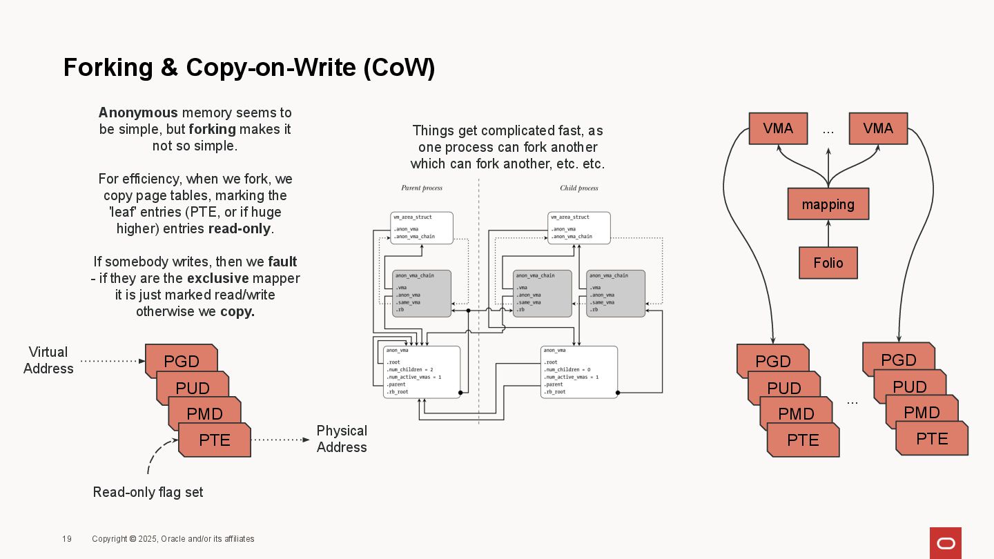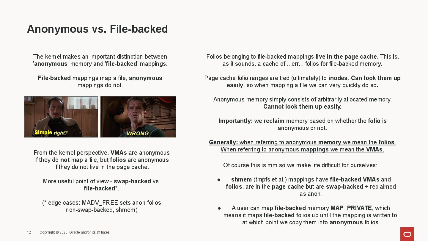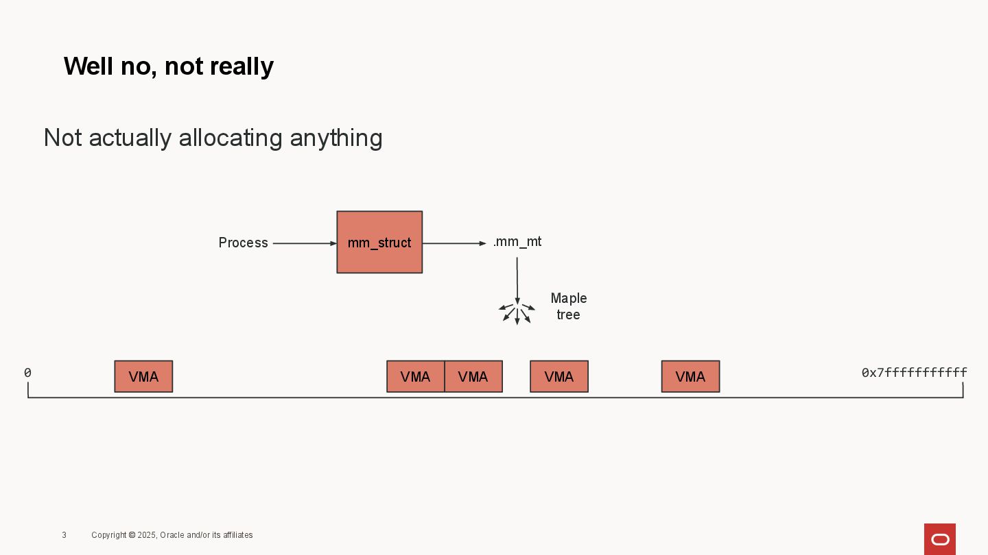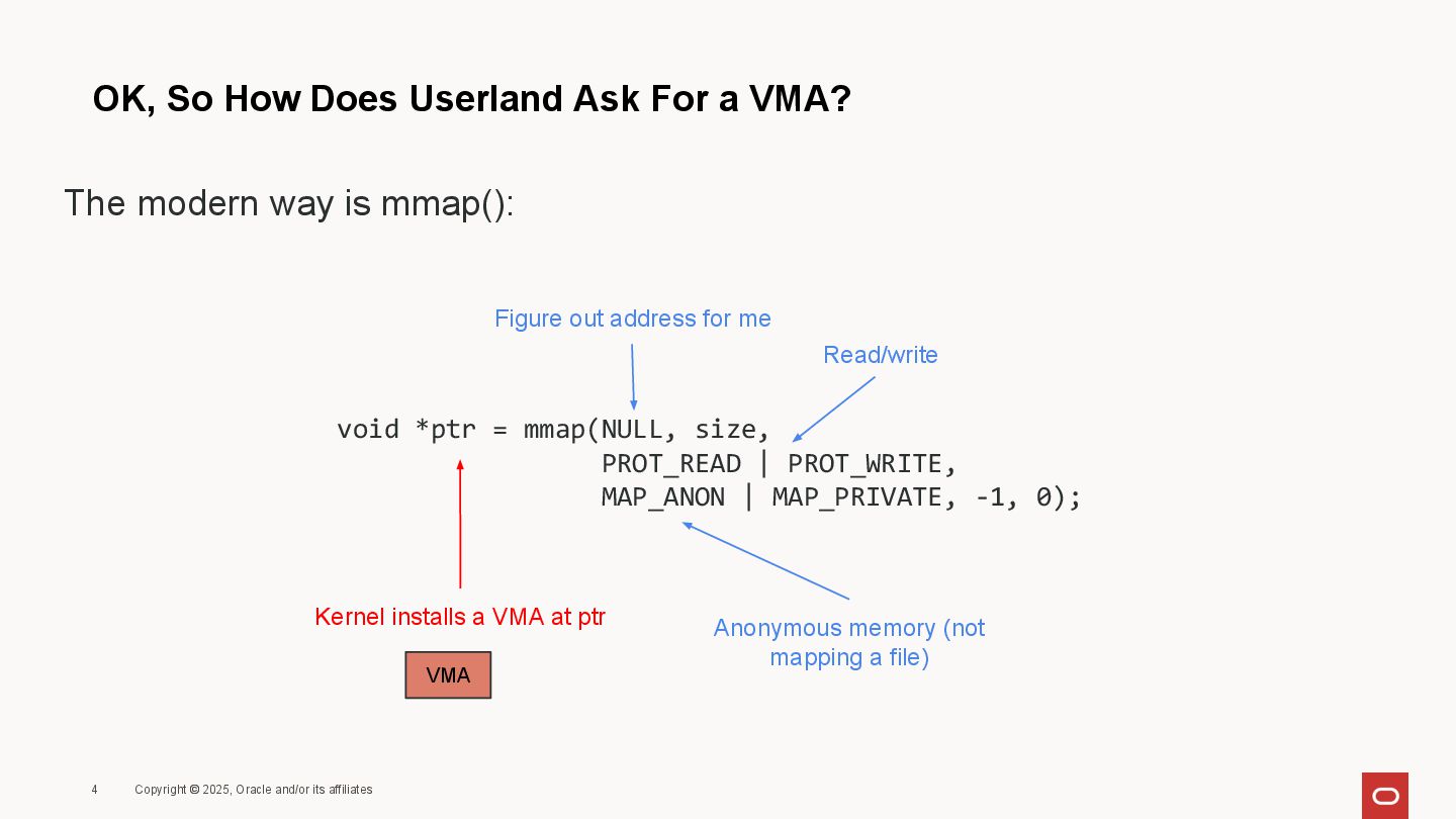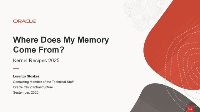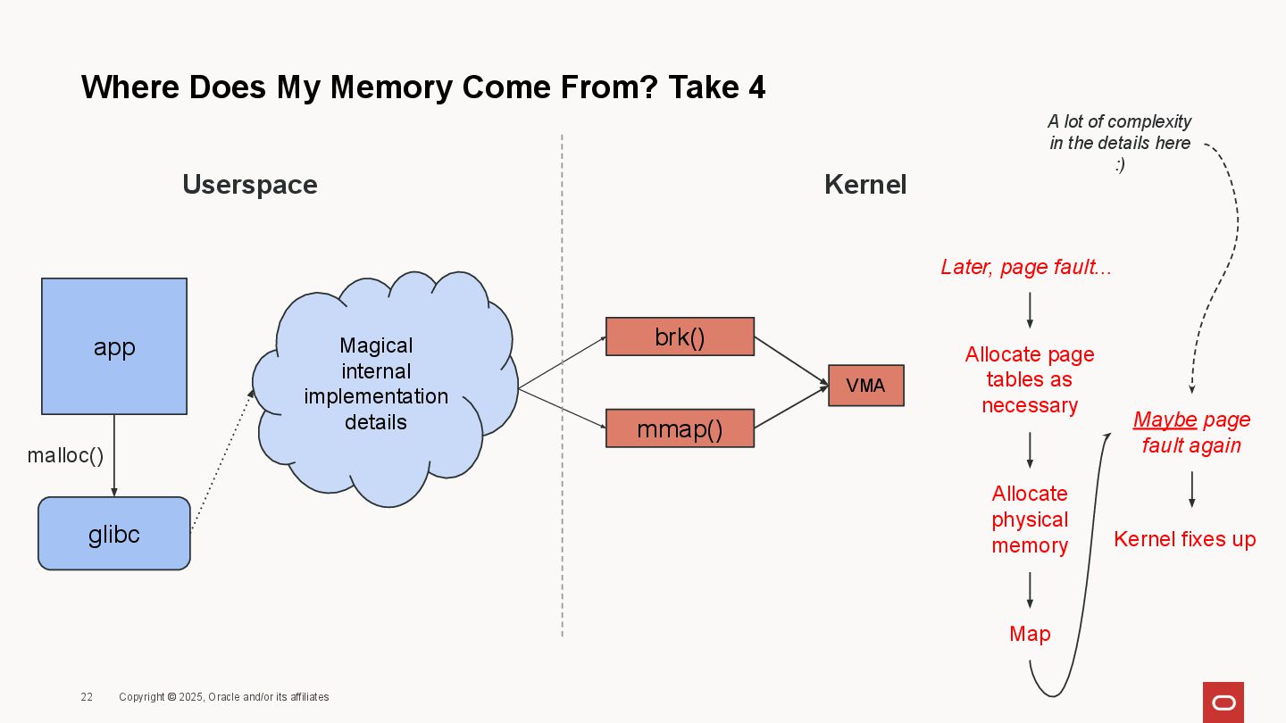 This talk provides a deep-ish dive into the APIs the kernel provides to userland to map memory, how they work internally, how the kernel tracks everything, what might happen to that memory (e.g. reclaim, migration) and how we handle that, the dread terror of forking, VMA merging and splitting and all those intricate cogs that must keep turning to do what seems the most fundamental thing any program might do – allocating memory.