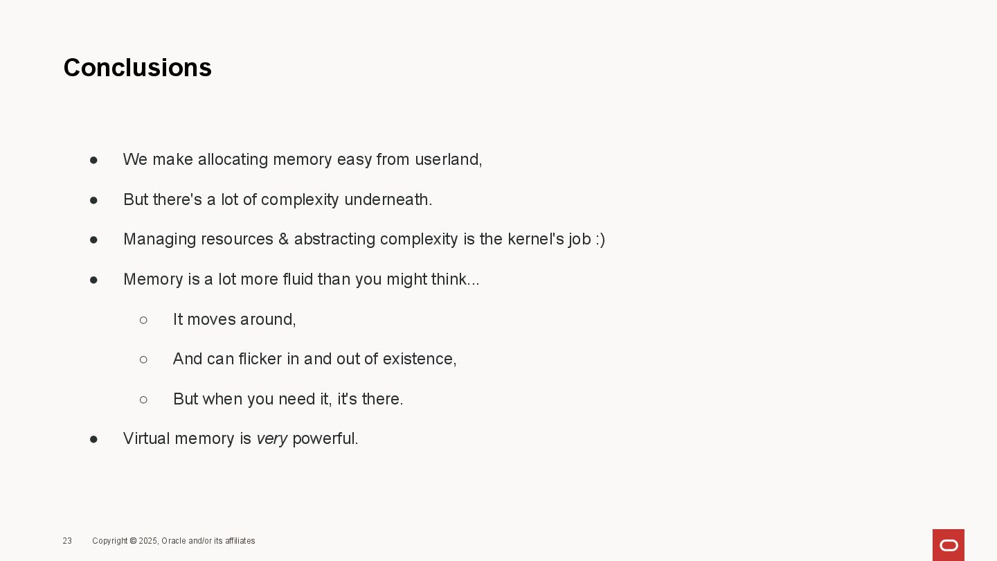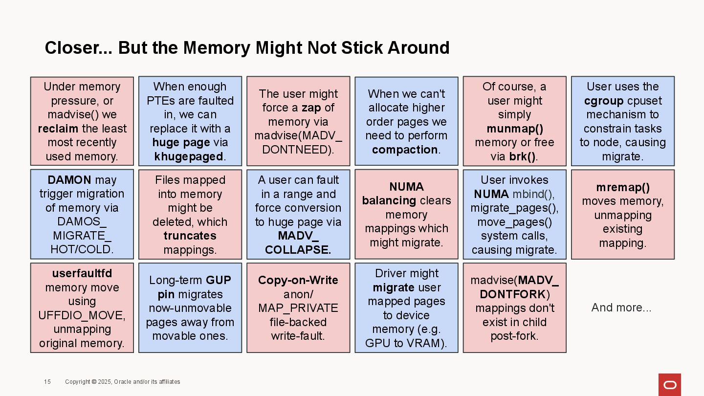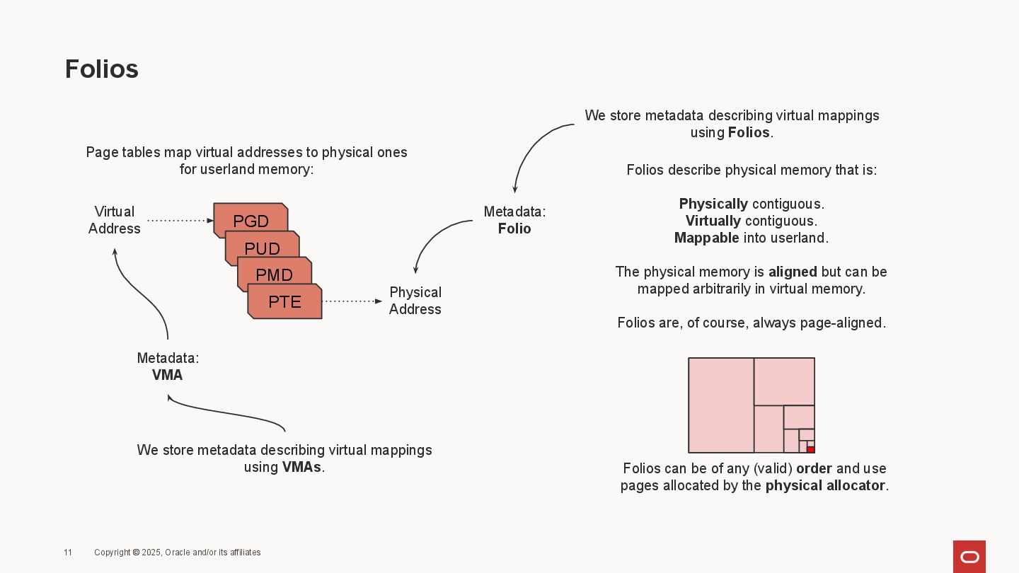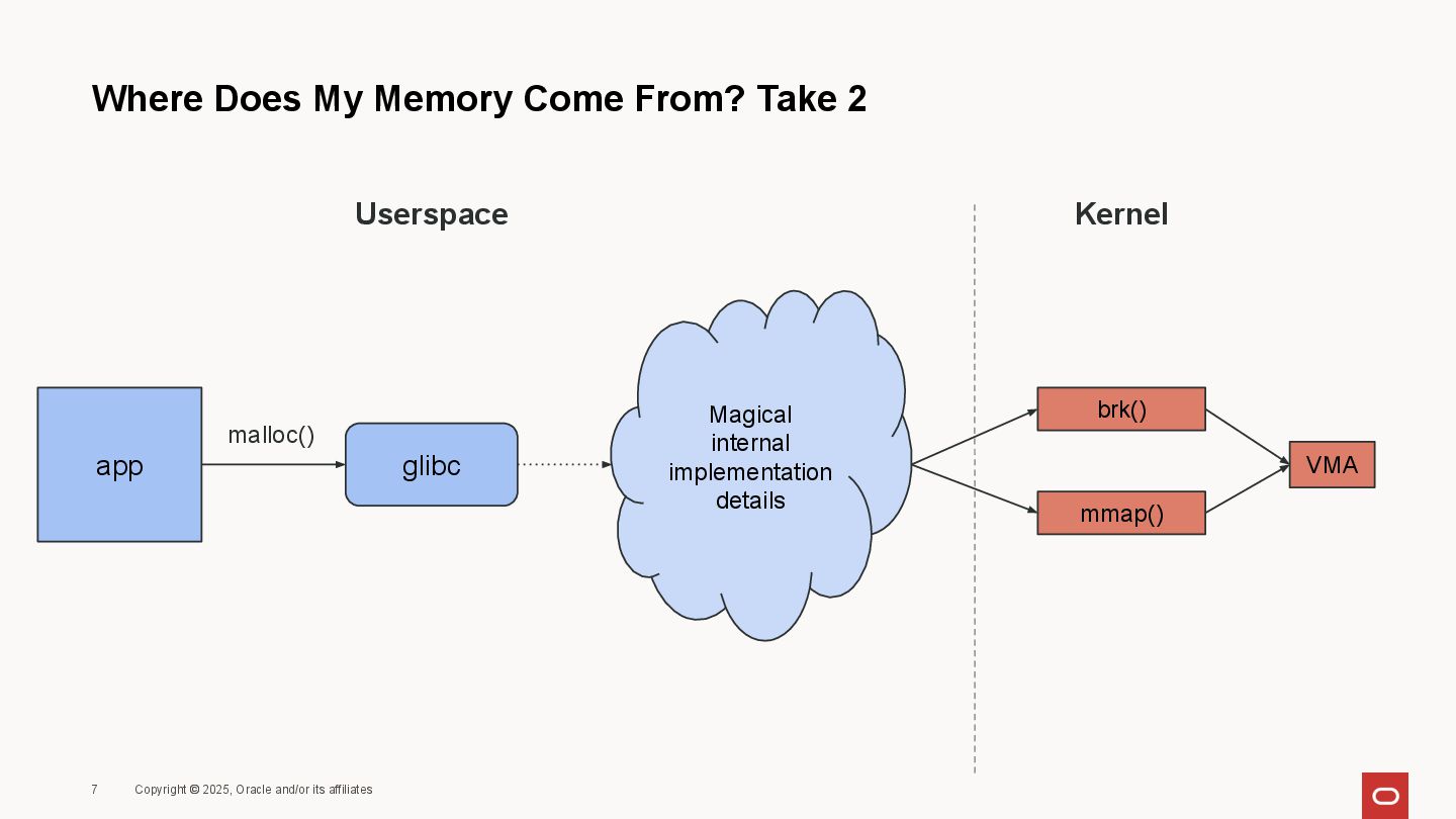 This talk provides a deep-ish dive into the APIs the kernel provides to userland to map memory, how they work internally, how the kernel tracks everything, what might happen to that memory (e.g. reclaim, migration) and how we handle that, the dread terror of forking, VMA merging and splitting and all those intricate cogs that must keep turning to do what seems the most fundamental thing any program might do – allocating memory.