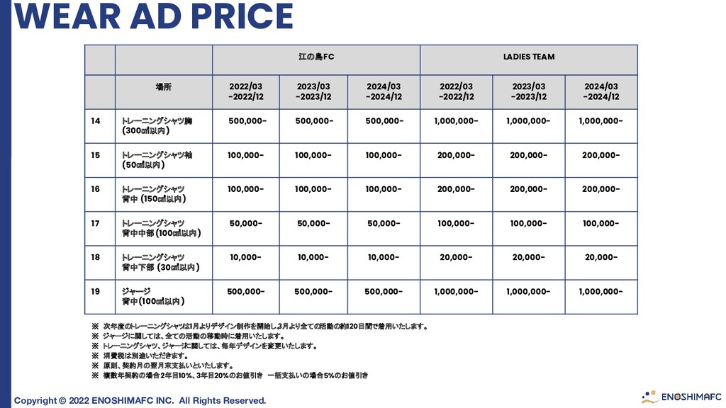 PRICE 江の島FC LADIES TEAM 場所 2022/03 -2022/12 2023/03 -2023/12 2024/03 -2024/12 2022/03 -2022/12 2023/03 -2023/12 2024/03 -2024/12 9 胸 (300㎠以内) 1,500,000- 3,000,000- 3,000,000- 2,000,000- 6,000,000- 6,000,000- 10 左袖 (50㎠以内) 750,000- 1,500,000- 1,500,000- 1,000,000- 3,000,000- 3,000,000- 11 背中 (200㎠以内) 1,000,000- 2.000,000- 2,000,000- 1,330,000- 4,000,000- 4,000,000- 12 背中下部 (150㎠以内) 900,000- 1.800,000- 1,800,000- 1,200,000- 3,600,000- 3,600,000- 13 パンツ (80㎠以内) 500,000- 1,000,000- 1,000,000- 660,000- 2,000,000- 2,000,000- ※ 次年度のユニフォームは 1月よりデザイン制作を開始し、 3月より全てのTRMや公式戦の約 50試合で着用いたします。 ※ ユニフォームに関しては、毎年デザインを変更いたします。 ※ 消費税は別途いただきます。 ※ 原則、契約月の翌月末支払いといたします。 ※ 複数年契約の場合: 2年目10%、3年目20%のお値引き 一括支払いの場合: 5%のお値引き