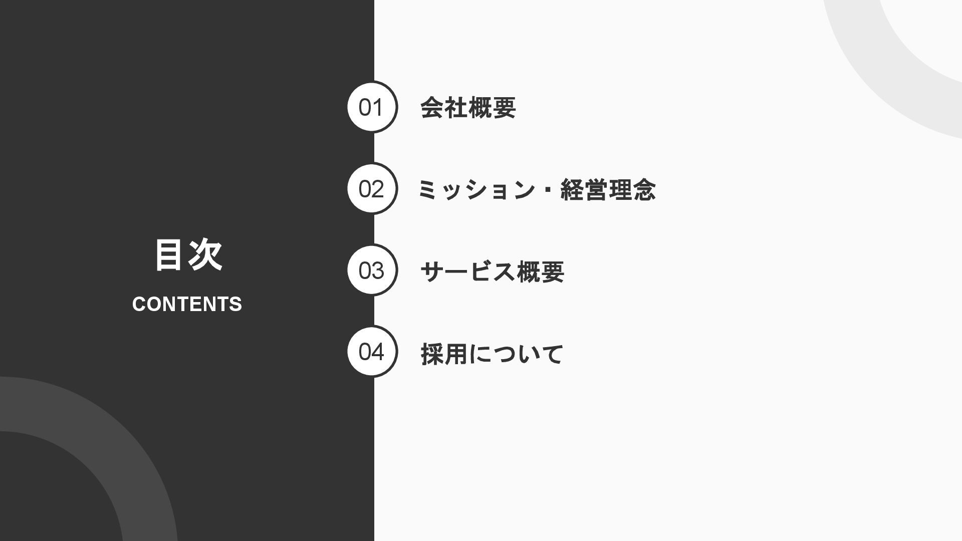 01 会社概要 02 ミッション・経営理念 03 サービス概要 04 CONTENTS 目次 採用について