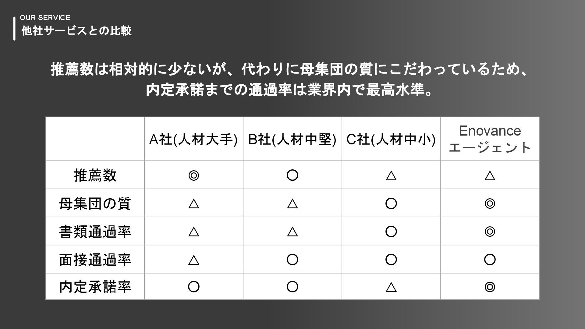 推薦数は相対的に少ないが、代わりに母集団の質にこだわっているため、 内定承諾までの通過率は業界内で最高水準。 他社サービスとの比較 OUR SERVICE A社(人材大手) B社(人材中堅) C社(人材中小) Enovance エージェント