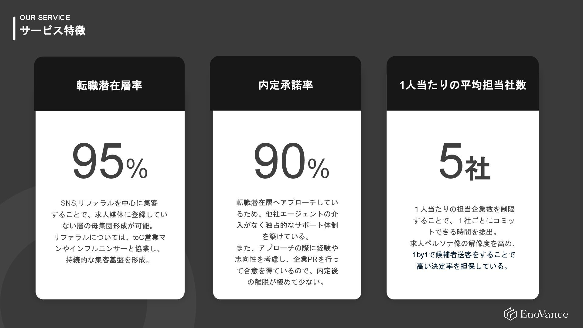 サービス特徴 OUR SERVICE 内定承諾率 転職潜在層率 1人当たりの平均担当社数 90% 5社 SNS,リファラルを中心に集客 することで、求人媒体に登録してい